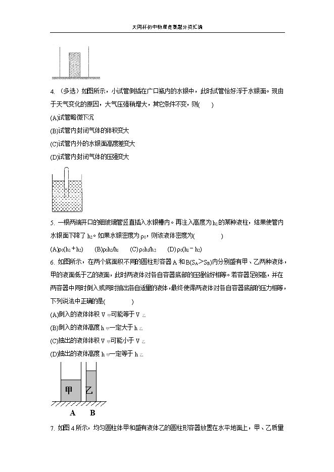 【内容简介】1.如图所示,甲、乙两个完全相同的直角三棱劈放置在水平桌面上。三棱劈的密度均匀且底面为矩形,若分别沿两物体图中虚线将右上侧切掉Δm甲和Δm乙,且Δm甲;Δm乙,则剩余部分对桌面的压强P甲和P乙的大小关系为( )(A)P甲;P乙 (B)P甲;P乙(C)P甲=P乙 (D)都有可能 【答案】B【解析】对于三棱劈对地的压强P=N/S=Mg/S= ,因此与高度有关,切除之后已的高度高,故选B。2. 如图所示,粗细均匀的玻璃管A和B由一橡皮管连接,一定质量的空气被水银柱封闭在A管内,初始时两管水银面一样高,B管上方与大气相通。若固定A管,将B管沿竖直方向缓慢上移一小段距离H,A管内的水银面相应升高h,则以下判断正确的是( )(A)h=H(B)h;H/2(C)h=H/2(D)H/2;h;H4 【答案】B【解析】B管向上移动,若A管水银面不变,则A管内压强会升高。温度不变,压强升高,则体积要减小,所以A管内的水银面相应升高。如果A管内的水银面升高H/2,则AB管水银面相平,即A管的压强没有增加,那么体积减小就矛盾了。所以选B。3. 如图所示,水平桌面上放置—底面积为S2的轻质圆柱形容器,容器足够深。在容器中放入底面积为S1、质量为m的圆柱形木块。在容器中缓慢加入水,当木块对容器底部的压力恰好为零时,容器对桌面的压力大小为( )(A) (B) (C) (D) 【答案】A【解析】浮力等于排开水的重量。设水深为h,则mg=ρ水S1hg。因此,水的重力加圆柱体的重力为: ,故选A。4. (多选)如图所示,小试管倒插在广口瓶内的水银中,此时试管恰好浮于水银面。现由于天气变化的原因,大气压强稍增大,其它条件不变,则( )(A)试管略微下沉(B)试管内封闭气体的体积变大(C)试管内外的水银面高度差变大(D)试管内封闭气体的压强变大 【答案】AD【解析】设试管内外水银面高度差为h,横截面积为s,重为G。则管内气体压强为:P=P0+ρ汞gh. 又因为试管浮力等于重力,所以ρ水gsh=G。因为G不变,所以h不变,P0变大,所以P变大,则管内气体体积要变小,即试管要下沉。综合分析,AD正确。5. 一根两端开口的细玻璃管竖直插入水银槽内。再注入高度为h1的某种液柱,结果使管内水银面下降了h2。如果水银密度为ρ0,则该液体密度为( )(A)ρ0(h1+h2) (B)ρ0h2/hl (C) ρ0h1/h2 (D) ρ0(h1-h2)【答案】B【解析】根据二力平衡,当玻璃管内水银面下降下h2时,管内液体与水银在此处的压强相等,即:ρgh1=ρ0gh2,故选B.6. 如图所示,在两个底面积不同的圆柱形容器A和B(SA>SB)内分别盛有甲、乙两种液体,甲的液面低于乙的液面,此时两液体对各自容器底部的压强恰好相等。若容器足够高,并在两容器中同时倒入或同时抽出各自适量的液体,最终使得两液体对各自容器底部的压力相等,下列说法中正确的是( )(A)倒入的液体体积V甲可能等于V乙(B)倒入的液体高度h甲一定大于h乙(C)抽出的液体体积V甲可能小于V乙(D)抽出的液体高度h甲一定等于h乙 【答案】C 【解析】由已知条件可知ρ甲;ρ乙,G甲;G乙,所以容器底部受到的压力N甲;N乙。选项A,若倒入的液体体积V甲=V乙,会使甲对底部的压力更大于乙;选项B,倒入的液体高度h甲;h乙,则倒入的液体体积V甲;V乙,使甲对底部的压力更大于乙;选项D,可能会使两容器底部受到的压力相等,但未必需要抽出的液体高度一定相等。选项C,虽然V甲;V乙,但ρ甲;ρ乙,所以抽出的液体的重力也可能甲大,从而满足题目要求。 7. 如图4所示,均匀圆柱体甲和盛有液体乙的圆柱形容器放置在水平地面上,甲、乙质量相等。现沿水平方向切去部分甲并从容器中抽取部分乙后,甲对地面的压强小于乙对容器底部的压强。若甲、乙剩余部分的体积分别是V甲、V乙,则( )A. V甲可能等于V乙 B. V甲可能大于V乙