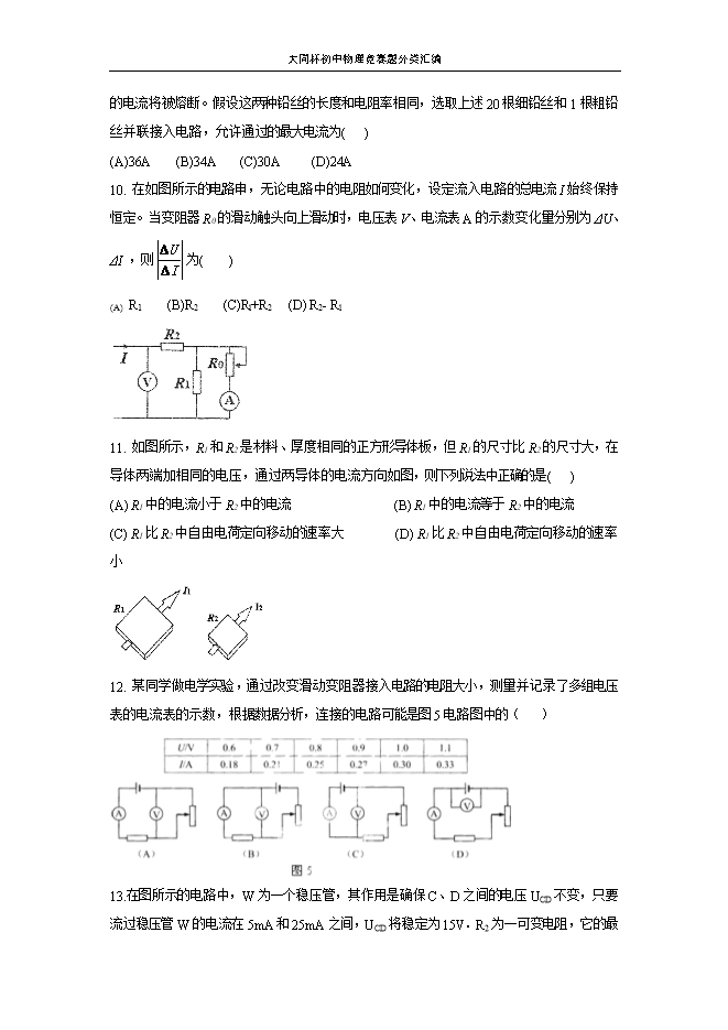 【内容简介】1.如图所示,把一个带负电的物体,靠近一个原来不带电的验电器的金属小球,然后用手去触摸金属小球(人体是通大地的导体),再移开手,这时( )(A)金属小球和金属箔都不带电(B)金属小球不带电,金属箔带负电(C)金属小球带正电,金属箔带负电(D)金属小球带正电,金属箔不带电 【答案】D【解析】因为人体是通大地的导体,所以在电荷的相互作用下,金属球中的部分自由电子被排斥到大地中,导致D选项的结果。2. 在如图所示的电路中,电阻R1和R2并联,则三个电表中( )(A)表1、表2是电流表,表3是电压表(B)表1、表2是电压表,表3是电流表(C)表1、表2、表3都是电流表(D)表1、表2、表3都是电压表 【答案】A 【解析】理想的电压表相当于断路,理想的电流表相当于导线。如果要满足R1和R2并联,则3所在的这根电路必须断开,1、2所在的电路必须导通。所以电流表要接在1、2的位置,电压表要接在3的位置3.电阻R1=1Ω,R2=1Ω,R3=3Ω,利用这三个电阻可能获得的不同阻值的个数最多为( )(A)7(B)12(C)16(D)17【答案】C【解析】分别用1个,2个,3个电阻进行串并联、混联。4.在如图所示的电路中,总电流I=1.0A,R1=2R2=2R3。则下列对通过R2的电流的判断正确的是( )(A)大小为020A,方向向右(B)大小为0.20A,方向向左(C)大小为0.40A,方向向右(D)大小为0.40A,方向向左 .【答案】D【解析】三个电阻的连接关系为并联,根据串、并联电路的关系得流过R1、R2、R3的电流大小分别为0.2、0.4、0.4A,再根据题图可知电流流经R2的方向为向左。所以选D。5.在如图所示的电路中,电源电压U保持不变,R1, R2, R3为定值电阻。移动滑动变阻器的滑片,使电压表V1,V2的示数分别增大△U1,△U2,在这个过程中( )(A)△U2;△U1(B)通过电阻R1的电流增加△U1/R1(C)通过电阻R2的电流减小△U2/R3(D)电阻R3两端的电压增大△U2 【答案】ABC【解析】因为U1= U-( UR2+ UR3),所以△U1=△UR2+△UR3同理△U2=△UR3, 所以A正确。由于电阻R1为定值电阻,电压增加U1,所以电流增加△U1/R1 。故B正确。流经电阻R1的电流为干路电流,等于流经电阻R3的电流,电阻R3两端的电压减小△U2,所以电流减小△U2/R3。故C正确,D错误。6.小红按照如图所示的电路进行实验。闭合电键后,移动滑片P的过程中,灯泡L始终不亮。为了查找电路故障,用电压表进行捡测,先将电压表的负接线柱与A接线柱相连,电压表的正接线柱依次与电路中的其它接线柱相连,对应的电压表示数如表格所示,若导线质量完好且接线柱连接完好,则可判断电路中一定存在故障的是( )(A)电池(B)电键(C)灯泡(D)滑动变阻器【答案】C【解析】接B至E点,电压表示数正常,说明电源、电键完好。接F点的电压表示数为零说明电灯断路 第6题图 第7题图7. 在如图所示的电路中,电源电压保持不变,R0为定值电阻,L1、L2为两个小灯泡,闭合电键,将滑动变阻器的滑片由左向右滑动时,下列说法中正确的是( )(A)小灯泡L2变暗,V1表的示数变小,V1表的示数变大(B)小灯泡L1变暗,V1表的示数变小,V1表的示数变大(C)小灯泡L2变亮,V1表的读数变大,V1表的示数变小(D)小灯泡L1变亮,V1表的示数变大,V2表的示数变小【答案】D【解析】首先电灯L1与滑动变阻器并联,再与L2串联,电表V1测量的是L1、L2的总电压,V2测量的是L2的电压。当滑动变阻器的滑片由左向右滑动时,电路中的总电阻变大,所以总电流变小,则L2两端电压变小,V2的示数变小。R0两端的电压也变小,所以V1表的示数变大。根据V1V2的示数变化,L1两端的电压变大,所以L1变亮。8.白炽灯泡的灯丝断开后,可把断头搭接起来使用,这时灯丝的( )(A)电阻变小,电流强度变大(B)电阻变大,电流强度变小(C)电阻和电流强度都变大(D)电阻和电流强度都变小【答案】A【解析】电阻丝的长度变短,所以电阻变小,电压不变,因此流过灯丝的电流变大。9. 直径d1=0.3mm的细铅丝通以1.5A的电流将被熔断,而直径d2=0.6mm的粗铅丝通以4A的电流将被熔断。假设这两种铅丝的长度和电阻率相同,选取上述20根细铅丝和1根粗铅丝并联接入电路,允许通过的最大电流为( )