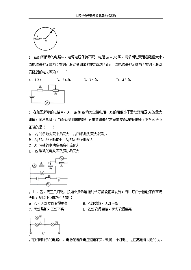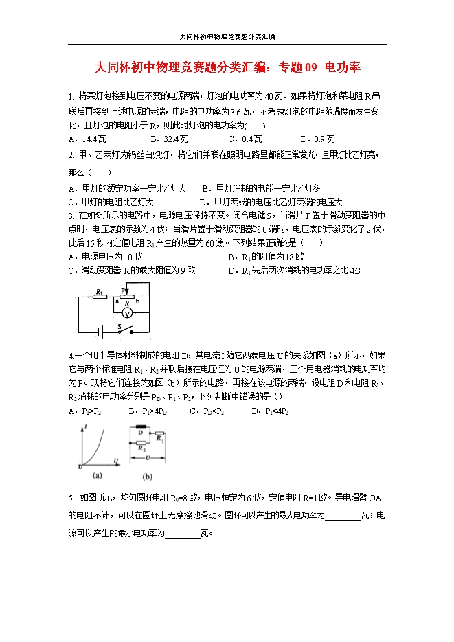 【内容简介】1. 将某灯泡接到电压不变的电源两端,灯泡的电功率为40瓦。如果将灯泡和某电阻R串联后再接到上述电源的两端,电阻的电功率为3.6瓦,不考虑灯泡的电阻随温度而发生变化,且灯泡的电阻小于R,则此时灯泡的电功率为( )A.14.4瓦 B.32.4瓦 C.0.4瓦 D.0.9瓦【答案】C【解析】解:当只接电灯时,∵P=I2R,∴ 当串联电阻R后, ∵接在同一电源上∴IRL=I′(R+RL),即: 化简得:9R2﹣82RRL+9RL2=0(9R﹣RL)(R﹣9RL)=0解得:9R=RL,或R=9RL,∵灯泡的电阻RL小于R(9R=RL舍去),灯和电阻串联∴PR:PL=R:RL=9:1∴PL= PR= ×3.6W=0.4W故选:C。2. 甲、乙两灯为钨丝白炽灯,将它们并联在照明电路里都能正常发光,且甲灯比乙灯亮,那么( )A.甲灯的额定功率一定比乙灯大 B.甲灯消耗的电能一定比乙灯多C.甲灯的电阻比乙灯大. D.甲灯两端的电压比乙灯两端的电压大【答案】A。【解析】A、两灯并联在照明电路里都能正常发光,且甲灯比乙灯亮,所以两灯的额定电压相同,甲灯的额定功率比乙灯大.A选项对.B、甲灯比乙灯亮,所以甲灯的功率比乙灯大,根据公式W=Pt可知,甲、乙两灯虽然并联在照明电路里,但通电时间不确定;故甲灯消耗的电能不一定比乙灯多.B选项错.C、并联在照明电路里甲灯比乙灯,加在两灯之间的电压相同,甲灯的功率比乙灯大,根据公式R=U2 /P 知,甲灯的电阻要比乙灯的电阻小;C选项错.D、甲、乙两灯并联在电路中,甲灯与乙灯两端的电压相等.D选项错.故选A.3. 在如图所示的电路中,电源电压保持不变。闭合电键S,当滑片P置于滑动变阻器的中点时,电压表的示数为4伏;当滑片置于滑动变阻器的b端时,电压表的示数变化了2伏,此后15秒内定值电阻R1产生的热量为60焦。下列结果正确的是( )A.电源电压为10伏B.R1的阻值为18欧C.滑动变阻器R的最大阻值为9欧D.R1先后两次消耗的电功率之比4:3 【答案】C。【解析】设电源电压为U,R和滑动变阻器R串联当滑片P位于中点时:(U-4)/ 4 = R1 / (R/2) (1)当滑片P位于右端时:(U-6)/ 6 = R1 / R (2)解(1)、(2)得U=12V,R1=R(不选择A)当滑片P置于变阻器的b端时,电压表示数是6V,R1电压U1=12V-6V=6VQ1=I²Rt=(U1²/R1)*t得到R1=U1²t/Q=(6V)²*15s/60J=9ΩR=R1=9Ω(选择C)滑片P至于变阻器的中点时P1=U1²/R1=(12V-4V)²/9Ω=64/9w滑片P置于变阻器的b端时P1'=U1'²/R1=(12V-6V)²/9Ω=4wP1:P1'=64/9w:4w=16:9(不选择D)4.一个用半导体材料制成的电阻D,其电流I随它两端电压U的关系如图(a)所示,如果它与两个标准电阻R1、R2并联后接在电压恒为U的电源两端,三个用电器消耗的电功率均为P。现将它们连接为如图(b)所示的电路,再接在该电源的两端,设电阻D和电阻R1、R2消耗的电功率分别是PD、P1、P2,下列判断中错误的是()A.P1;P2 B.P1;4PD C.PD;P2 D.P1;4P2 【答案】B。【解析】解:(1)当R1、R2、RD并联时,三电阻两端的电压相等,均为U,根据R= 可知,三电阻的功率相同时,则R1=R2=RD;(2)当它们连接为如图(b)所示的电路时,假如RD的电阻不变,则RD和R2并联后的电阻为 R2,由串联电路的电阻分压特点可知,电阻R1两端的电压变大为 U,并联部分的电压变小为 U,PD= = ,P1= = = =4PD;由a图可知可知,电压增大,电流增大,但电流的变化量比电压的变化量大,根据欧姆定律可知RD的电阻减小,所以当电压变小时,RD的电阻应变大,RD>R2;由并联电路电阻的特点:电阻越并越小,小于任何一个分电阻可知,并联后的总电阻应小于R1的阻值,即R1两端的电压大于R2、RD两端的电压,且并联部分分得的电压大于 U,R1两端的电压小于 U;根据P= 可知,P1>P2,PD<P2,P1>4PD。故选:B。5.如图所示,均匀圆环电阻R0=8欧,电压恒定为6伏,定值电阻R=1欧。导电滑臂OA的电阻不计,可以在圆环上无摩擦地滑动。圆环可以产生的最大电功率为_________瓦;电源可以产生的最小电功率为_________瓦。