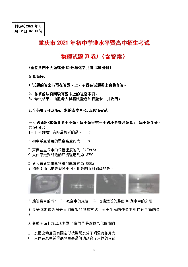 2021年重庆市中考物理真题(B卷,word版含答案)