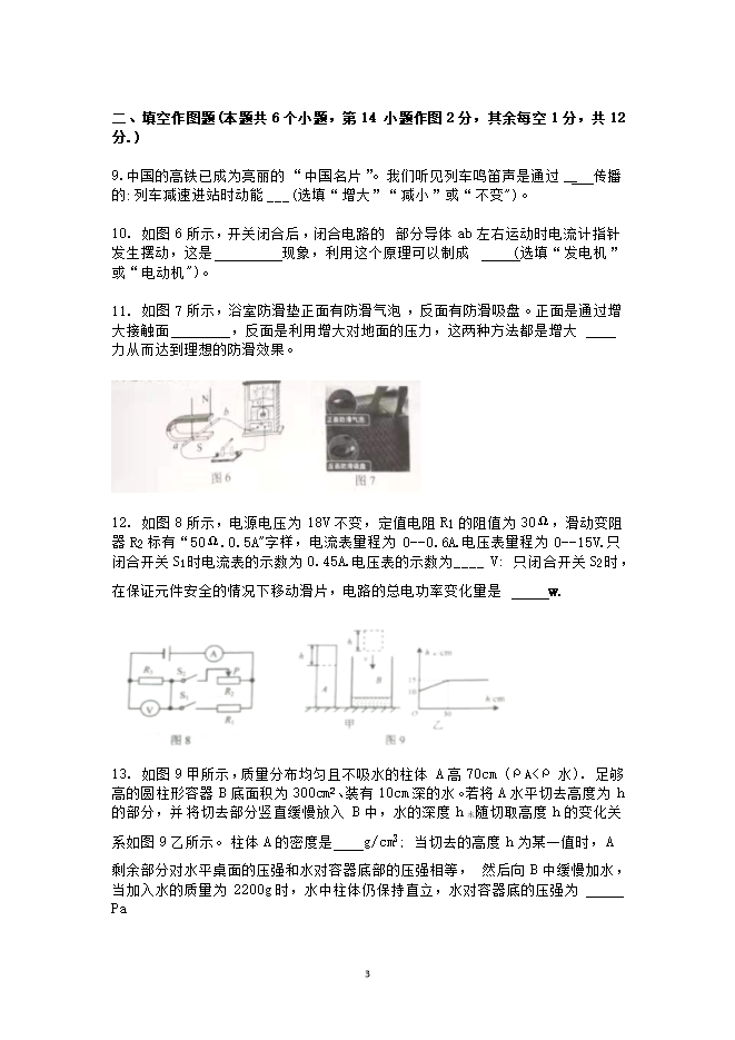 【内容简介】一、选择题(本题共8个小题,每小题只有一个选项最符合题意, 每小题3分,共24分.)1、下列数据与实际最接近的是( )A.初中学生使用的课桌高度约为0.8mB.声音在空气中的传播速度的为340km/sC.人体感觉到舒适的环境温度约为370C D.通过普通家用电视机的电流约为500A2.如图1所示的光现象中可以用光的折射解释的是( )A.后视镜中的汽车 B. 夜空中的光柱 C. 池底变浅的游鱼D.湖水中的夕阳3.冬泳逐渐成为部分人们喜爱的锻炼方式,关于冬泳的情景下列描述正确的是( )A.冬季湖面上方出现少量“白气”是液体汽化形成的B. 水易流动且没有固定形状说明水分子间没有作用力C. 人体在水中觉得寒冷主要是做功改变了人体的内能D. 在有风时出水后感觉特别冷是由于体表水蒸发吸热4.下列关于电学知知识说法正确的是( )A.洗衣机使用三孔插座主要是为了防止雷击B.使用测电笔时人手必须接触笔尾的金属体C.验电器的金属箔片张开是因为带异种电荷D.家庭电路中空气开关跳闸定是发生短路5.如图2所示,2021年5月22日,“祝融号”火星车驶离着陆平台,在火星表面行驶了0.522m, 迈出了我国星际探测的重要一下列说法正确的是( )A.火星车停在静止的着陆平台上没有惯性B.火星车驶离中相对于着陆平台是静止的C.火星车设计有宽大的轮子可以减小压强D.火星车静止在火星表面时不受力的作用6. 小杨同学任细观察了一间普通教空的照明电路,每盏灯规格相同,每个开关都能控制两盏电灯且都能正常发光,图3所示的电路中符合要求的是( ) 7. 如图4所示,老师在课堂上用自制的清轮组提升重物,将质量为36kg的重物在5s内匀建提升1m.他对绳的拉力产为200N不计绳重和摩擦,下列判断正确的是( )A. 动滑轮的重力为20NB.拉力所做的功为200JC.拉力做功的功率为40WD.滑轮组的机械效率为90%8.如图5所示,质量分布均匀的甲,乙两个正方体叠放在水平地面上,甲放在乙的中央。若乙的边长是甲的2倍,甲对乙的压强与乙对地面的压强相等,将它们分别放入足够多的水中静止时上下表面都处于水平位置,正方体乙漂浮且有3/10的体积浸入水中,下列判断正确的是( )A.甲、乙的质量之比m甲:m乙=1:4B.甲、乙的密度之比ρ甲:ρz=3:8C.甲、乙漫入水中的深度之比h甲:h乙=4:3D. 甲、乙在水中静止时所受浮力之比F甲.F乙=5:12二、填空作图题(本题共6个小题,第14 小题作图2分,其余每空1分,共12分.)9.中国的高铁已成为亮丽的“中国名片”。我们听见列车鸣笛声是通过__ 传播的:列车减速进站时动能___(选填“增大”“减小”或“不变")。10. 如图6所示,开关闭合后,闭合电路的 部分导体ab左右运动时电流计指针发生摆动,这是 现象,利用这个原理可以制成 (选填“发电机”或“电动机")。11. 如图7所示,浴室防滑垫正面有防滑气泡,反面有防滑吸盘。正面是通过增大接触面 ,反面是利用增大对地面的压力,这两种方法都是增大 力从而达到理想的防滑效果。
