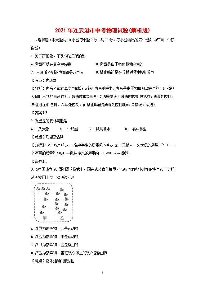 2021年江苏省连云港市中考物理试题(word解析版)