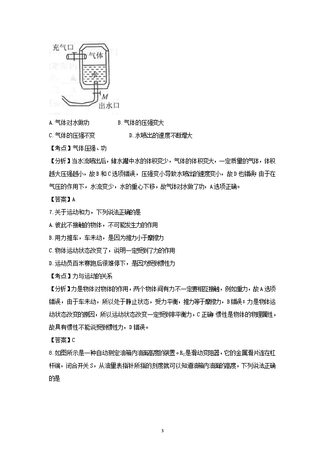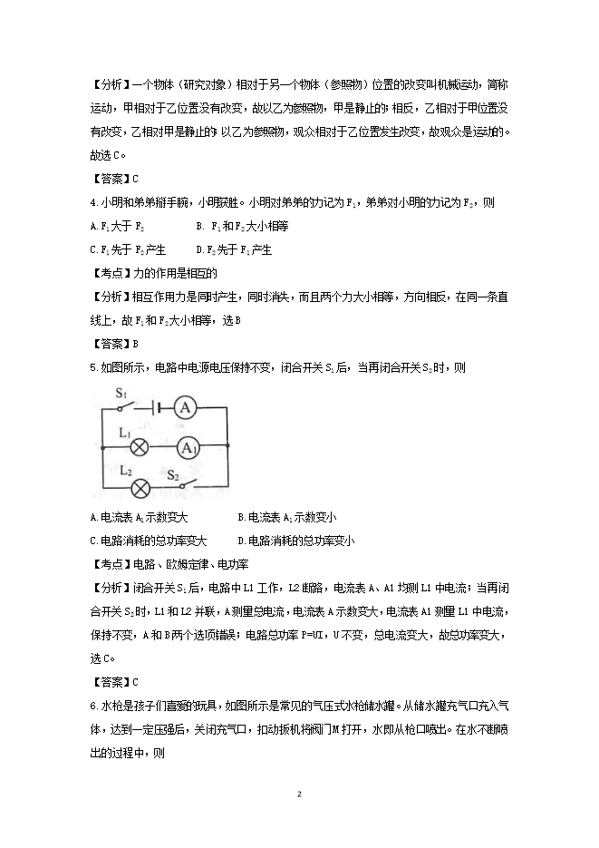 【内容简介】3.新中国成立70周年阅兵仪式上,国产武装直升机甲、乙两个编队排列并保持“70”字样从天安门上空平稳飞过,则 A.以甲为参照物,乙是运动的B.以乙为参照物,甲是运动的C.以甲为参照物,乙是静止的D.以乙为参照物,坐在观众席上的观众是静止的【考点】物体运动的相对性【分析】一个物体(研究对象)相对于另一个物体(参照物)位置的改变叫机械运动,简称运动,甲相对于乙位置没有改变,故以乙为参照物,甲是静止的;相反,乙相对于甲位置没有改变,乙相对甲是静止的;以乙为参照物,观众相对于乙位置发生改变,故观众是运动的。故选C。【答案】C4.小明和弟弟掰手腕,小明获胜。小明对弟弟的力记为F1,弟弟对小明的力记为F2,则A.F1大于F2B. F1和F2大小相等C.F1先于F2产生D.F2先于F1产生【考点】力的作用是相互的【分析】相互作用力是同时产生,同时消失,而且两个力大小相等,方向相反,在同一条直线上,故F1和F2大小相等,选B【答案】B5.如图所示,电路中电源电压保持不变,闭合开关S1后,当再闭合开关S2时,则 A.电流表A1示数变大B.电流表A1示数变小C.电路消耗的总功率变大D.电路消耗的总功率变小【考点】电路、欧姆定律、电功率【分析】闭合开关S1后,电路中L1工作,L2断路,电流表A、A1均测L1中电流;当再闭合开关S2时,L1和L2并联,A测量总电流,电流表A示数变大,电流表A1测量L1中电流,保持不变,A和B两个选项错误;电路总功率P=UI,U不变,总电流变大,故总功率变大,选C。【答案】C6.水枪是孩子们喜爱的玩具,如图所示是常见的气压式水枪储水罐。从储水罐充气口充入气体,达到一定压强后,关闭充气口,扣动扳机将阀门M打开,水即从枪口喷出。在水不断喷出的过程中,则 A.气体对水做功B.气体的压强变大C.气体的压强不变 D.水喷出的速度不断增大【考点】气体压强、功【分析】当水流喷出后,储水罐中水的体积变少,气体的体积变大,一定质量的气体,体积越大压强越小,故B和C选项错误,压强变小导致水喷出的速度变小,故D也错误;由于在气压的作用下,水流变少,水的重心下移,故气体对水做了功,A选项正确。【答案】A7.关于运动和力,下列说法正确的是A.彼此不接触的物体,不可能发生力的作用B.用力推车,车未动,是因为推力小于摩擦力C.物体运动状态改变了,说明一定受到了力的作用D.运动员百米赛跑后很难停下,是因为受到惯性力【考点】力与运动的关系【分析】力是物体对物体的作用,两个物体间有力不一定要相互接触,例如重力,故A选项错误,由于车未动,所以处于静止状态,受力平衡,推力等于摩擦力,B错误;力是物体运动状态改变的原因,所以运动状态改变一定受到非平衡力,C正确;惯性是物体的物理属性,故具有惯性不能说受到惯性力,D错误。