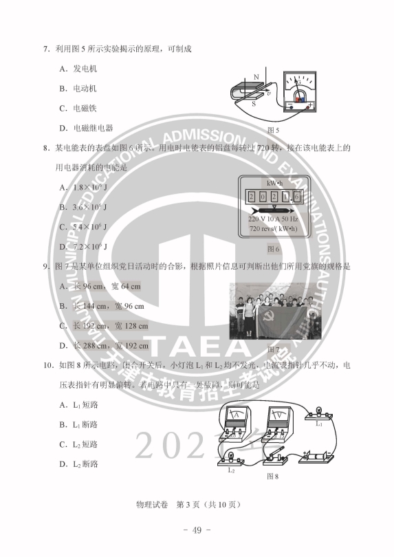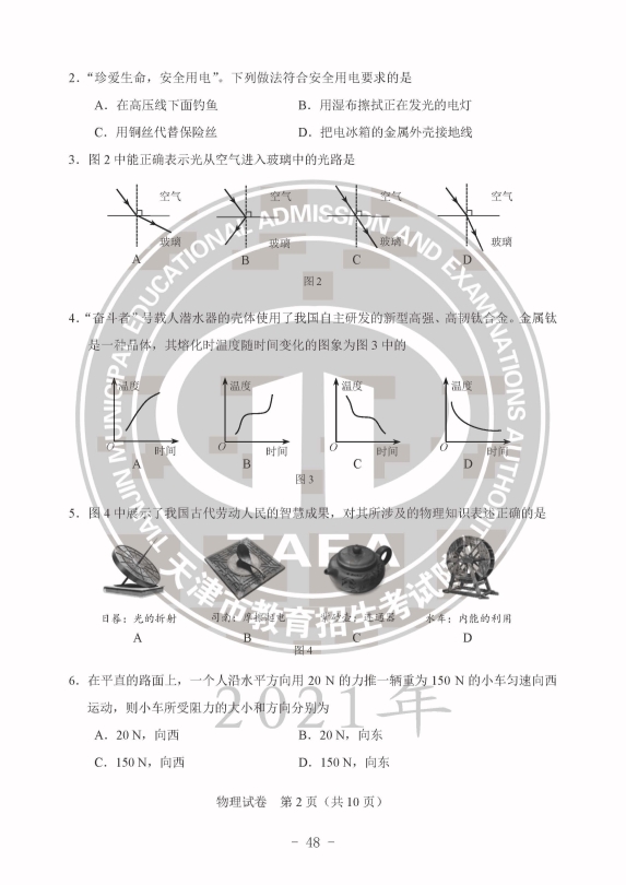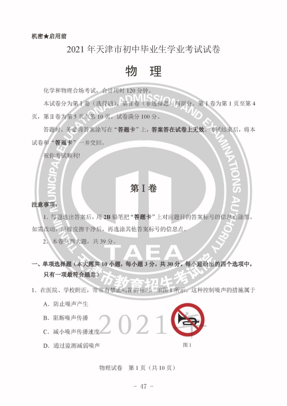 2021年天津市中考真题物理真题(pdf版,含答案)