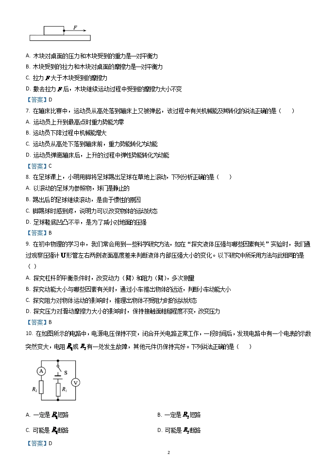 【内容简介】第Ⅰ卷(选择题共30分)一、选择题(本题共15题,共30分。以下每题各只有一个正确答案,选对得2分;多选、错选均不得分;把正确答案的序号用铅笔涂在答题卡的规定位置)1. 下列对数据的估测中,最接近实际的是( )A. 家用空调的电功率约为 B. 一名初中生所受重力约为 C. 一枚一元硬币的直径约为 D. 人正常步行的速度约为 【答案】A2. 关于声现象的描述,下列说法中正确的是( )A. “闻其声而知其人”,是根据声音的响度来分辨人B. 利用超声波清洗眼镜,说明声波能传递信息C. “公共场所不要大声喧哗”,是要求人们说话降低音调D. 发声的音叉与水面接触时“水花四溅”,说明声音是由物体振动产生的【答案】D3. “霜降”是中国传统的二十四节气之一,霜的形成属于( )A. 凝华B. 液化C. 凝固D. 升华【答案】A4. 生活处处有物理,下列生活现象所涉及 光学知识,说法正确的是( )A. 夜晚人在路灯下形成的影子,是光的折射形成的B. 清澈的池水看起来变浅了,是由光的反射引起的C. 雨后的彩虹,是光的色散现象D. 在教室各个方向都能看到课桌上的书,是由于光照到书上发生了镜面反射【答案】C5. 下列电路连接正确的是( )A. B. C. D. 【答案】C6. 如图所示,木块在水平拉力 的作用下,在足够长的水平桌面上做匀速直线运动,下列说法正确的是( ) A. 木块对桌面的压力和木块受到的重力是一对平衡力B. 木块受到的拉力和木块对桌面的摩擦力是一对平衡力C. 拉力 大于木块受到的摩擦力D. 撤去拉力 后,木块继续运动过程中受到的摩擦力大小不变【答案】D7. 在蹦床比赛中,运动员从高处落到蹦床上又被弹起,该过程中有关机械能及其转化的说法正确的是( )A. 运动员上升到最高点时重力势能为零B. 运动员下降过程中机械能增大C. 运动员从高处下落到蹦床前,重力势能转化为动能D. 运动员弹离蹦床后,上升的过程中弹性势能转化为动能【答案】C8. 在足球课上,小明用脚将足球踢出足球在草地上滚动,下列分析正确的是( )A. 以滚动的足球为参照物,球门是静止的B. 踢出后 足球继续滚动,是由于惯性的原因C. 脚踢球时感到疼,说明力可以改变物体的运动状态D. 足球鞋底凹凸不平,是为了减小对地面的压强【答案】B9. 在初中物理的学习中,我们常会用到一些科学研究方法,如在“探究液体压强与哪些因素有关”实验时,我们通过观察压强计 形管左右两侧液面高度差来判断液体内部压强大小的变化。以下研究中所采用方法与此相同的是( )A. 探究杠杆 平衡条件时,改变动力(臂)和阻力(臂),多次测量B. 探究动能大小与哪些因素有关时,通过小车推出物体的远近,判断小车动能大小C. 探究阻力对物体运动的影响时,推理出物体不受阻力时的运动状态D. 探究压力对滑动摩擦力大小的影响时,保持接触面粗糙程度不变,改变压力【答案】B