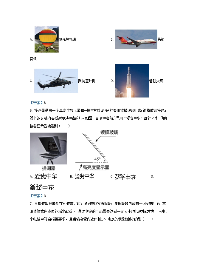 【内容简介】一、选择题(本题共12小题,每小题2分。共24分。每小题给出的选项中只有一个选项符合题意)1. 2021年5月16日,我国自主研发的“天问一号”火星探测器成功将“祝融号”火星车着落到火星表面,探测器从火星向地球传递信息是通过( )A. 红外线B. 超声波C. 电磁波D. 次声波【答案】C2. 海洋生物学家研究发现,生活在澳大利亚海岸附近的长鳍领航鲸能模仿对手虎鲸发出的声音,有些声音人耳听起来竟然不能分辨出是长鳍领航鲸发出的,这表明它能模仿对手声音的( )A. 音色B. 响度C. 声速D. 音调【答案】A3. 下列图中能反映发电机工作原理的是( )A. B. C. D. 【答案】B4. 下列有关物理量的估计,符合实际的是( )A. 教室门框的高度约为1500mmB. 人感觉舒适的环境温度约为37℃C. 中学生正常行走的速度约为5km/hD. 一个中学生体重约为50N【答案】C5. 在下列几种航空器中,主要利用压强和流速的关系获得升力的是( )A. 观光热气球B. 民航客机C. 武装直升机D. 运载火箭【答案】B6. 提词器是由一个高亮度显示器和一块与其成45°角的专用镀膜玻璃组成,镀膜玻璃将显示器上的文稿内容反射到演讲者前方。如图,当演讲者前方呈现“爱我中华”四个字时,他直接看显示器会看到( ) A. B. C. D. 【答案】D7. 某输液警报器能在药液流完时,通过电铃发声报警,该报警器内部有一可变电阻R,其阻值随管内液体的减少面减小,通过电铃的电流需要达到一定大小时电铃才能发声,下列几个电路中符合报警要求,且当输液管内液体越少,电表的示数也越小的是( )