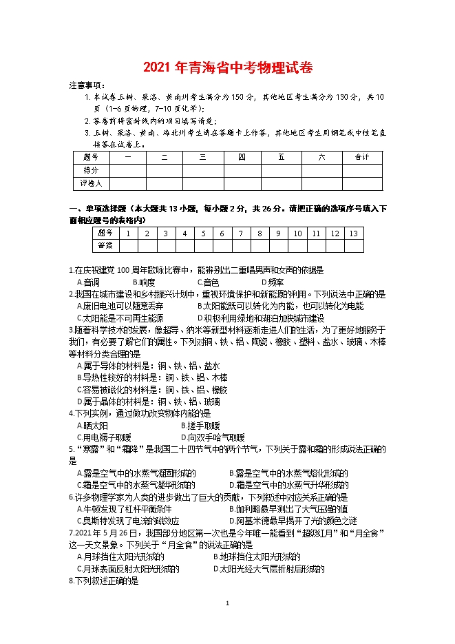 【内容简介】注意事项:1.本试卷玉树、果洛、黄南州考生满分为150分,其他地区考生满分为130分,共10页(1-6页物理,7-10页化学);2.答卷前将密封线内的项目填写清楚;3.玉树、果洛、黄南、海北州考生请在答题卡上作答,其他地区考生用钢笔或中性笔直接答在试卷上。题号一二三四五六合计得分评卷人一、单项选择题(本大题共13小题,每小题2分,共26分。请把正确的选项序号填入下面相应题号的表格内)题号12345678910111213答案1.在庆祝建党100周年歌咏比赛中,能辨别出二重唱男声和女声的依据是A.音调B.响度C.音色D.频率2.我国在城市建设和乡村振兴计划中,重视环境保护和新能源的利用。下列说法中正确的是A.废旧电池可以随意丢弃B.太阳能既可以转化为内能,也可以转化为电能C.太阳能是不可再生能源D.积极利用绿地和湖泊加快城市建设3.随着科学技术的发展,像超导、纳米等新型材料逐渐走进人们的生活,为了更好地服务于我们,有必要了解它们的属性。下列对铜、铁、铝、陶瓷、橡胶、塑料、盐水、玻璃、木棒等材料分类合理的是A.属于导体的材料是:铜、铁、铝、盐水B.导热性较好的材料是:铜、铁、铝、木棒C.容易被磁化的材料是:铜、铁、铝、橡胶D.属于晶体的材料是:铜、铁、铝、玻璃4.下列实例,通过做功改变物体内能的是A.晒太阳B.搓手取暖C.用电褥子取暖D.向双手哈气取暖5.“寒露”和“霜降”是我国二十四节气中的两个节气,下列关于露和霜的形成说法正确的是A.露是空气中的水蒸气凝固形成的B.露是空气中的水蒸气熔化形成的C.霜是空气中的水蒸气凝华形成的D.霜是空气中的水蒸气升华形成的6.许多物理学家为人类的进步做出了巨大的贡献,下列叙述中对应关系正确的是A.牛顿发现了杠杆平衡条件B.伽利略最早测出了大气压强的值C.奥斯特发现了电流的磁效应D.阿基米德最早揭开了光的颜色之谜7.2021年5月26日,我国部分地区第一次也是今年唯一能看到“超级红月”和“月全食”这一天文景象。下列关于“月全食”的说法正确的是A.月球挡住太阳光形成的B.地球挡住太阳光形成的C.月球表面反射太阳光形成的D.太阳光经大气层折射后形成的8.下列叙述正确的是A.宇航员从地球到太空,惯性会发生变化B.我国C919大型运输机在空投物资时,应在目的地正上方进行空投C.做圆周运动的物体,当它所受外力同时消失,物体将停止运动D.乘坐轿车时必须要系上安全带,是为了防止惯性带来的危害9.一凸透镜的焦距为12cm,将点燃的蜡烛从离凸透镜30cm处沿主光轴移到15cm处的过程中,像的大小和像距的变化情况是A.像变小,像距变小B.像变大,像距变大C.像变大,像距变小D.像变小,像距变大10.在如图1所示的四个实验装置中,能用来探究流体压强与流速关系的是