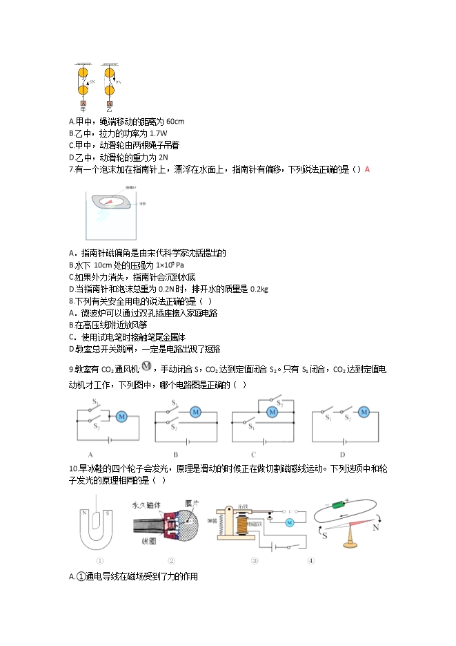 【内容简介】一、单选题(每小题只有一个选项符合题意,每题2分,共20分)1.下列有关声现象的表述正确的是( ) A.图甲,分别用大小相同的力敲击三个装水的瓶子,产生的声音音调相同B.图乙,医生用听诊器判断患者的情况,利用了声音传递能量C.图丙,逐渐抽出玻璃罩内的空气,听见闹铃声越来越小,推理得出真空不能传声D.图丁,禁止鸣笛是在传播递过程中减少噪声2.下列说法正确的是()A.放大镜下拇指变大——光的色散B.列队时,前面的同学挡住了后面的同学——平面镜成像C.彩虹——光沿直线传播D.深圳湾大桥的倒影——光的反射3.下列说法错误的是( )A.人吃冰淇淋,感觉很凉爽——热传递B.冬天搓手取暖——做功改变物体的内能C.酒精喷在手上感到凉快——液化吸热D.夏天刚从冰箱拿出来的冰棍外有白霜——凝华4.下列杠杆中属于费力杠杆的是( ) 5.滑草是一项时尚的运动,以下说法正确的是( )A.人行走时比脚站在草地上时,对草地压强更小B.由于受到惯性的作用,滑行速度越来越大C.越向下滑,重力势能越大D.人受到滑动摩擦力的方向与运动方向相反6.如图,两个滑轮组,提升一个重为17N 的物体A,(每个滑轮重相同)使物体A在2s内拉升了20cm,拉力如图所示,下列说法正确的是( ).....