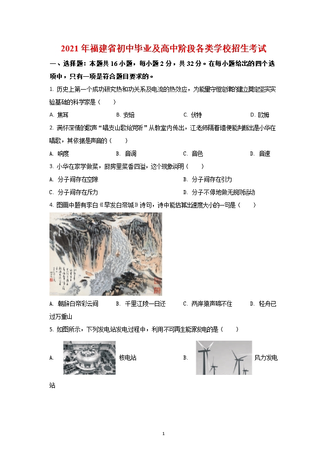 【内容简介】一、选择题:本题共16小题,每小题2分,共32分。在每小题给出的四个选项中,只有一项是符合题目要求的。1. 历史上第一个成功研究热和功关系及电流的热效应,为能量守恒定律的建立奠定坚实实验基础的科学家是( )A. 焦耳B. 安培C. 伏特D. 欧姆2. 满怀深情的歌声“唱支山歌给党听”从教室内传出,江老师隔着墙便能判断出是小华在唱歌,其依据是声音的( )A. 响度B. 音调C. 音色D. 音速3. 小华在家学做菜,厨房里菜香四溢,这个现象说明( )A. 分子间存在空隙B. 分子间存在引力C. 分子间存在斥力D. 分子不停地做无规则运动4. 图画中题有李白《早发白帝城》诗句,诗中能估算出速度大小的一句是( )......
