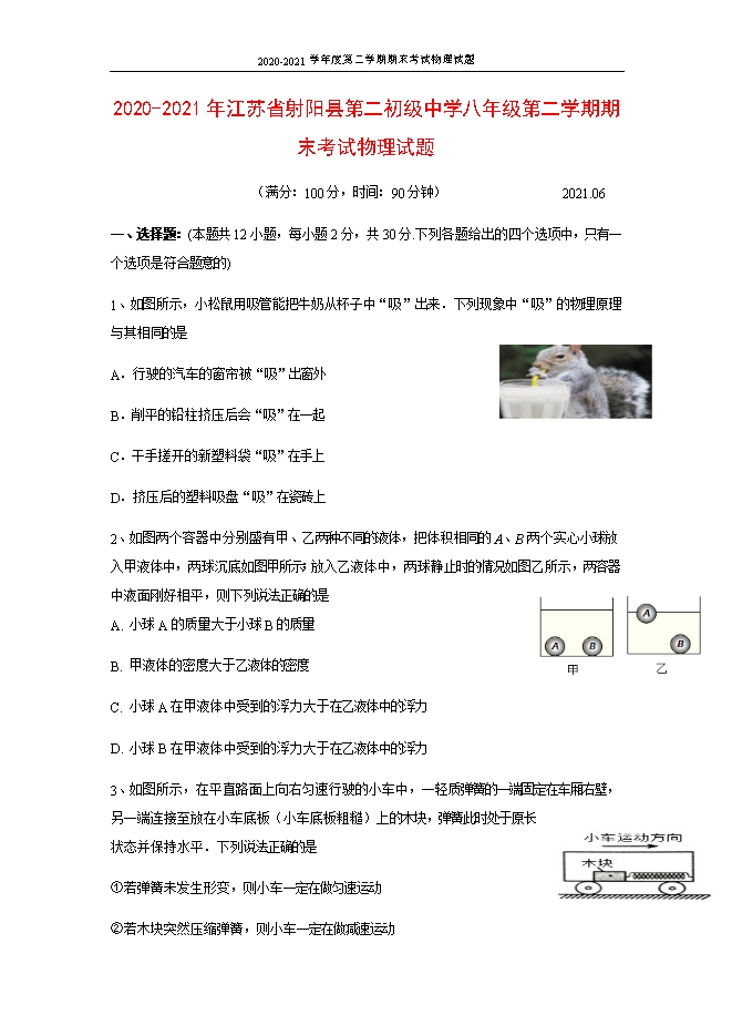 【内容简介】一、选择题:(本题共12小题,每小题2分,共30分.下列各题给出的四个选项中,只有一个选项是符合题意的)1、如图所示,小松鼠用吸管能把牛奶从杯子中“吸”出来.下列现象中“吸”的物理原理与其相同的是 A.行驶的汽车的窗帘被“吸”出窗外B.削平的铅柱挤压后会“吸”在一起C.干手搓开的新塑料袋“吸”在手上D.挤压后的塑料吸盘“吸”在瓷砖上2、如图两个容器中分别盛有甲、乙两种不同的液体,把体积相同的A、B两个实心小球放入甲液体中,两球沉底如图甲所示;放入乙液体中,两球静止时的情况如图乙所示,两容器中液面刚好相平,则下列说法正确的是A. 小球A的质量大于小球B的质量B. 甲液体的密度大于乙液体的密度C. 小球A在甲液体中受到的浮力大于在乙液体中的浮力D. 小球B在甲液体中受到的浮力大于在乙液体中的浮力3、如图所示,在平直路面上向右匀速行驶的小车中,一轻质弹簧的一端固定在车厢右壁,另一端连接至放在小车底板(小车底板粗糙)上的木块,弹簧此时处于原长状态并保持水平.下列说法正确的是 ......