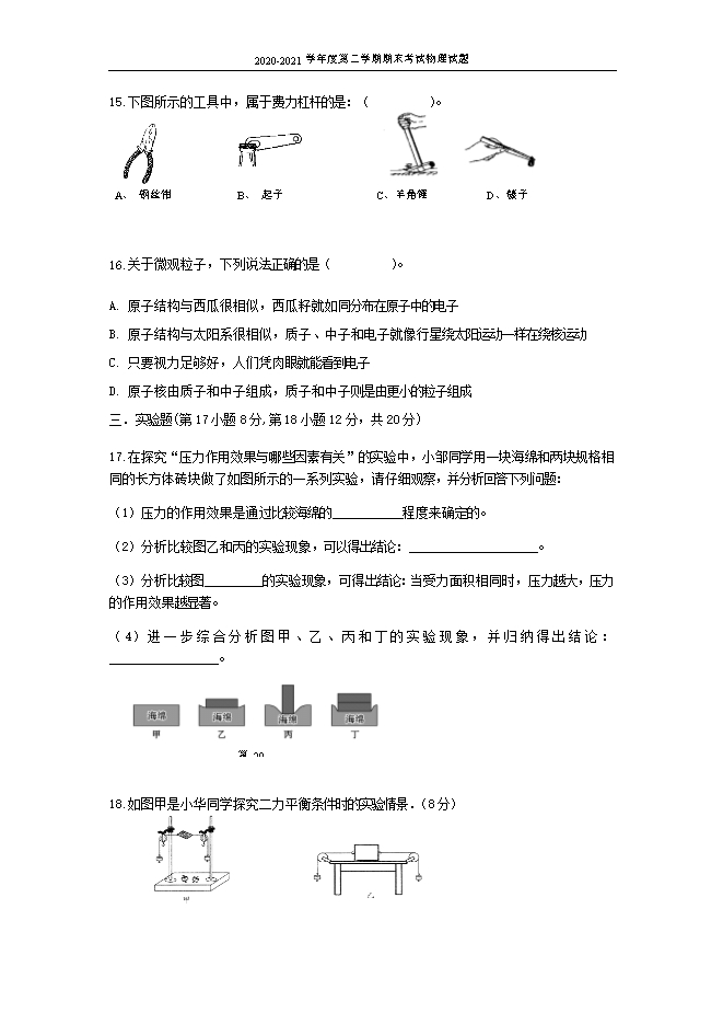 2020-2021年安徽省淮南市八公山区物理八年级第二学期期末试卷(word版,含答案)