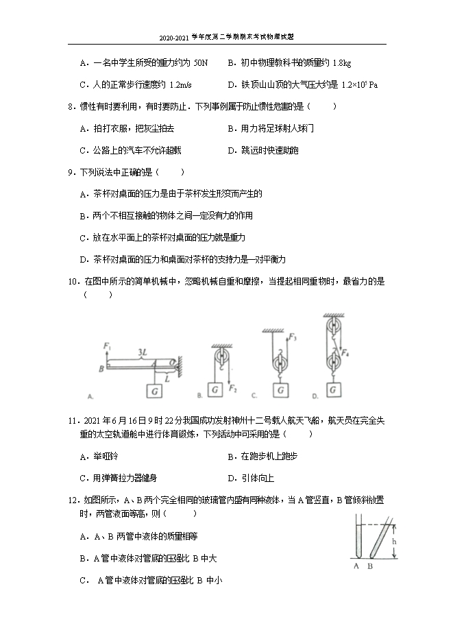 所属专辑: 【精品】2020-2021学年各版本八年级物理下学期期末测试卷