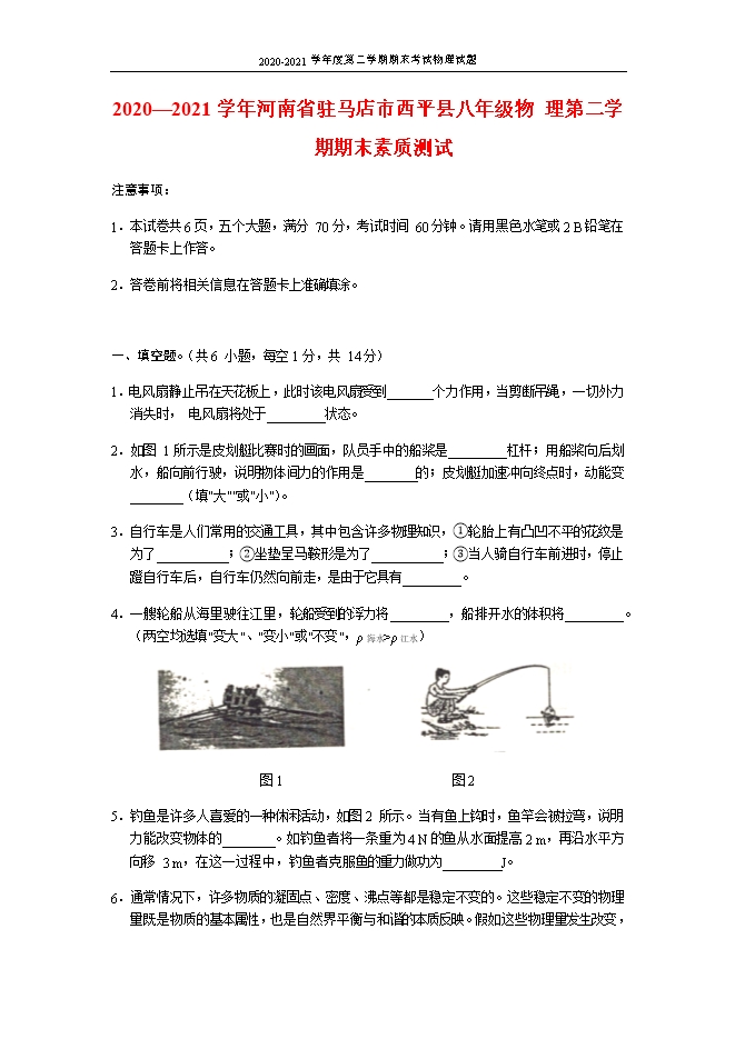 2020-2021年河南省驻马店市西平县物理八年级第二学期期末试卷(word版,含答案)
