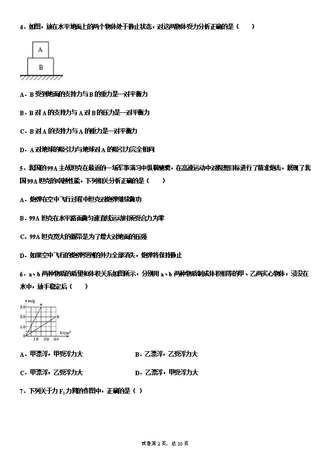 【内容简介】一、单选题1.在水平桌面上,有两个相同的圆柱形容器,内盛相同深度的盐水.将同一个鸡蛋分别放入其中,鸡蛋静止时如图所示.鸡蛋在甲、乙两杯中所受浮力分别为F1和F2,盐水对容器底部压强分别为p1和p2,则,A.F1;F2,p1;p2B.F1=F2,p1;p2C.F1;F2,p1=p2D.F1=F2,p1;p22.如图所示,一辆在高速公路上匀速直线运动的汽车,下列有关说法正确的是( )A.汽车对路面的压力与路面对汽年的支持力是一对平衡力B.关闭发动机后,汽车能继续前进,是由于受到惯性的作用C.汽车尾部的气流偏导器做成上平下凸的形状,其作用是使汽车获得向上的升力D.座位上的安全带又宽又软,是为了减小对人体的压强3.如图所示,重为G的均匀硬棒悬于O点成竖直,现在下端施一水平拉力让棒缓慢转过r角,在棒转动的过程中以下说法中不正确的是( )A.动力臂逐渐变小B.阻力乘以阻力臂逐渐变大C.动力F逐渐变大D.动力F逐渐变小......