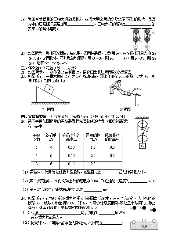 【内容简介】1.关于地球上的物体,下列说法中正确的是A.在“天上”绕地球飞行的人造卫星不受重力作用B.物体只有落向地面时才受到重力作用C.将物体竖直向上抛出,物体在上升阶段所受的重力比落向地面时小D.物体所受重力的大小与物体的质量有关,与物体是否运动及怎样运动无关2.如图是小明自制的“大炮”示意图。当瓶内产生的气体增多时,瓶塞会水平向右冲出,若此时所有外力全部消失,瓶塞将A.立即沿竖直方向下落到地面B.向上运动C.水平向右做匀速直线运动D.立即静止3.一艘轮船从长江驶入东海,船受到的浮力A.变大B.变小C.不变D.条件不足,无法判断4.下列实例中,重力对物体做功的是A.跳水运动员从跳台跳下B.球在光滑水平面上滚动C.背着书包在水平路面上前进D.举重运动员举起杠铃停在空中5.四个同学在公园进行登山比赛.如果规定功率最大者获胜,那么最后胜出者一定是A.体重最大的一个B.时间最短的一个C.做功最快的一个D.速度最大的一个6.如图所示的四个实例中,机械能正在减小的是 7.“给我一个支点和一根足够长的棍,我就能撬起整个地球。”如图所示,生产和生活中的杠杆与阿基米德设想的杠杆属于同一类型的是 A.啤酒扳手 B.天平 C.扫帚D.钓鱼竿......