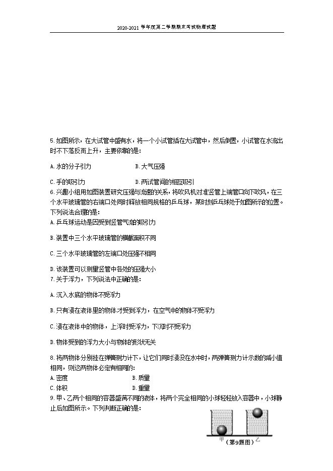 【内容简介】一、选择题(每题有唯一正确的答案,填涂在答题卡上。2分×20=40分)1.下列物体的尺度由大到小排列的是:A.夸克、原子核、质子、原子B.质子、原子核、原子、夸克C.夸克、质子、原子核、原子D.原子、原子核、质子、夸克2.一根细棉线一拉就断,而一根细铁丝却不容易拉断,这是因为:A.棉线不是由分子组成的B.棉线的分子之间没有引力,铁丝的分子间有引力C.棉线的分子之间的引力远小于铁丝的分子间有引力D.棉线的分子之间存在着斥力,铁丝的分子间没有斥力3.下列生活实例中,属于增大压强的是:A.铁轨下面铺放枕木 B.啄木鸟有个坚硬而细长的喙 C.推土机用宽大的履带来支撑 D.书包的背带制作得较宽 4.在A、B两个完全相同的试管里,分别盛有水和酒精,且两试管中的液面相平,如图所示,若水对A管底部的压强为pA,酒精对B管底部的压强为pB,已知ρ水>ρ酒精,则:A.pA>pB B.pA<pBC.pA=pB D.无法比较二者大小5.如图所示,在大试管中盛有水,将一个小试管插在大试管中,然后倒置,小试管在水流出时不下落反而上升,主要依靠的是:A.水的分子引力 B.大气压强 C.手的吸引力 D.两试管间的相互吸引 6.兴趣小组用如图装置研究压强与流速的关系,将吹风机对准竖管上端管口向下吹风,在三个水平玻璃管的右端口处同时释放相同规格的乒乓球,某时刻乒乓球处于如图所示的位置。下列说法合理的是:A.乒乓球运动是因受到竖管气流的吸引力 B.装置中三个水平玻璃管的横截面积不同 C.三个水平玻璃管的左端口处压强不相同 D.该装置可以测量竖管中各处的压强大小7.关于浮力,下列说法中正确的是:A.沉入水底的物体不受浮力 B.只有浸在液体里的物体才受到浮力,在空气中的物体不受浮力......