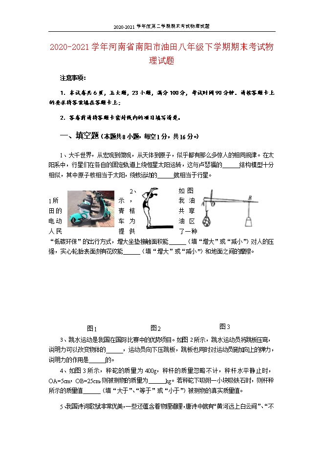 【内容简介】一、填空题(本题共8小题,每空1分,共16分。)1、大千世界,从宏观到微观,从天体到原子,似乎都有那么多惊人的相同规律。在太阳系中,行星们在各自的固定轨道上绕恒星太阳运转,这与卢瑟福的 结构模型十分相似,其中原子核相当于太阳,绕核运动的 就相当于行星。2、如图1所示,我油田的青桔共享电动车为油区人民提供了一种“低碳环保”的出行方式,增大坐垫接触面积能 (填“增大”或“减小”)对人的压强,实心轮胎表面刻有花纹能 (填“增大”或“减小”)和地面之间的摩擦。3、跳水运动是我国在国际比赛中的优势项目。如图2所示,跳水运动员将跳板压弯,说明力可以改变物体的 ,运动员向下压跳板,跳板也同时对运动员施加向上的弹力,说明力的作用是 的。4、如图3所示,秤砣的质量为400g,秤杆的质量忽略不计,秤杆水平静止时,OA=5cm,OB=25cm,则被测物的质量为 kg。若秤砣下吸附一小块吸铁石时,则杆秤所示的质量值 (填“大于”、“等于”或“小于”)被测物的真实质量值。5、我国诗词歌赋非常优美,一些还蕴含着物理道理,唐诗中就有“黄河远上白云间”、“不尽长江滚滚来”的诗句,从物理学的角度来看,前一句生动形象地表明黄河水存储着大量的 能,后一句表明长江水具有大量的 能。6、如图4所示,斜面长5m,高1m,工人用沿斜面方向400N的力把重1600N的集装箱匀速推到车上,推力对集装箱做的功是 J,斜面的机械效率是 。7、病人在输液时,考虑到静脉的血压,药水瓶上除了输液管外,另外还插有一根“闲置”的管,管口朝上“敞开”在空气中,如图5所示。这是利用 让药液顺利进入静脉,同时还要保证药水瓶相对针管有一定的高度,血液才不会流到输液管内,说明病人静脉的血压 (填“大于”、“等于”或“小于”)大气压强。8、如图6所示是用竹篾和薄纸制成的孔明灯,所用材料质量为50g,容积为0.5m3,常温下空气的密度为1.3kg/m3,则该孔明灯内空气的质量为 kg。点燃孔明灯下端的小碟内的松脂,加热孔明灯内部的空气,随着温度升高,空气分子的运会更加剧烈,分子间的空隙会随之增大,当它的密度变为 kg/m3,孔明灯恰好能悬浮在空中。(不考虑松脂质量的减少,物体在空气中受到的浮力也可用阿基米德原理计算,g取10N/kg).......