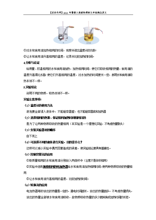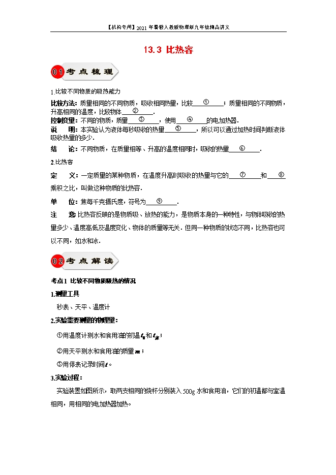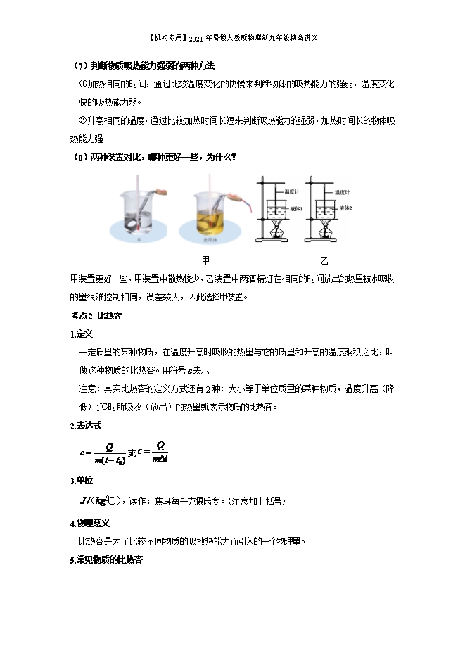 【内容简介】1.比较不同物质的吸热能力比较方法:质量相同的不同物质,吸收相同热量,比较 ① ;质量相同的不同物质,升高相同的温度,比较物体 ② .控制变量:不同的物质,质量 ③ ,使用 ④ 的电加热器.说 明:本实验认为液体每秒吸收的热量 ⑤ ,所以可以通过加热时间判断液体吸收热量的多少.结 论:不同物质,在质量相等、升高的温度相同时,吸收的热量 ⑥ .2.比热容定 义:一定质量的某种物质,在温度升高时吸收的热量与它的 ⑦ 和 ⑧ 乘积之比,叫做这种物质的比热容.单 位:焦每千克摄氏度,符号为 ⑨ .注 意:比热容反映的是物质吸、放热的能力,是物质本身的一种特性,与物体吸收的热量多少、温度高低及温度变化、物体的质量等无关.但同一种物质的状态不同,比热容也可以不同,如水和冰.答案:①温度变化多少 ②吸收热量的多少 ③相同 ④相同规格 ⑤相同 ⑥不同 ⑦质量 ⑧升高的温度 ⑨J/(kg•℃) 考点1 比较不同物质吸热的情况1.测量工具秒表、天平、温度计2.实验需要测量的物理量:①用温度计测水和食用油的初温 和 ;②用天平测水和食用油的质量 ;③用停表记录时间 。3.实验过程:实验装置如图所示,取两支相同的烧杯分别装入500g水和食用油,它们的初温都与室温相同,用相同的电加热器加热。 ①对水和食用油加热相同的时间,观察并读出温度计的示数;②让水和食用油升高相同的温度,记录并比较加热的时间。4.分析与论证给质量、初温相同的水和食用油加热,加热相同时间,使它们吸收相同的热量,食用油的温度升高得比水高;使它们升高相同的温度,对水加热的时间更长一些,表明水和食用油吸热本领不一样。5.实验结论说明不同的物质,吸热本领不一样。实验注意事项:(1)温度计的使用方法液泡要全部浸入液体中,不能碰容器壁,也不能碰容器底和加热器(2)选择相同的热源、保证相同加热时间相同目的是为了让两种物质吸收的热量相同(本实验是一个理想化实验,不考虑热量散失)(3)安装实验器材的顺序自下而上(4)可选择不同的液体进行实验,目的是什么?这样可以减小实验中偶然因素造成的误差,使实验结论更具有普遍性。(5)控制变量法的应用①取质量相同的水和食用油分别放入两烧杯中(注意不是体积相同)②实验中选用规格相同的电加热器给水和食用油加热相同时间,使两种物质吸收的热量相同③让水和食用油升高相同的温度,比较加热的时间。(6)转换法的应用电加热器每秒放出的热量是一定的,通电时间越长,放出的热量越多。不考虑热量损失,放出的热量全部被水和食用油吸收,故物质吸收热量的多少就转换成加热时间的长短。(7)判断物质吸热能力强弱的两种方法①加热相同的时间,通过比较温度变化的快慢来判断物体的吸热能力的强弱,温度变化快的吸热能力弱。②升高相同的温度,通过比较加热时间长短来判断吸热能力的强弱,加热时间长的物体吸热能力强(8)两种装置对比,哪种更好一些,为什么?