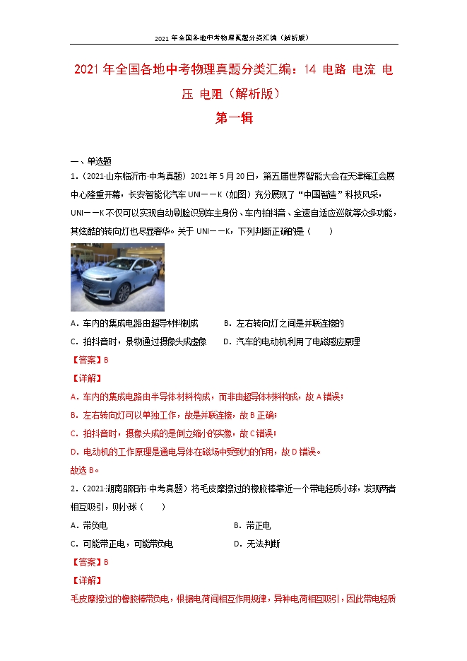 【内容简介】1.(2021•山东临沂市•中考真题)2021年5月20日,第五届世界智能大会在天津梅江会展中心隆重开幕,长安智能化汽车UNI——K(如图)充分展现了“中国智造”科技风采,UNI——K不仅可以实现自动刷脸识别车主身份、车内拍抖音、全速自适应巡航等众多功能,其炫酷的转向灯也尽显奢华。关于UNI——K,下列判断正确的是( )A.车内的集成电路由超导材料制成 B.左右转向灯之间是并联连接的C.拍抖音时,景物通过摄像头成虚像 D.汽车的电动机利用了电磁感应原理【答案】B【详解】A.车内的集成电路由半导体材料构成,而非由超导体材料构成,故A错误;B.左右转向灯可以单独工作,故是并联连接,故B正确;C.拍抖音时,摄像头成的是倒立缩小的实像,故C错误;D.电动机的工作原理是通电导体在磁场中受到力的作用,故D错误。故选B。2.(2021•湖南邵阳市•中考真题)将毛皮摩擦过的橡胶棒靠近一个带电轻质小球,发现两者相互吸引,则小球( )A.带负电B.带正电C.可能带正电,可能带负电D.无法判断【答案】B【详解】毛皮摩擦过的橡胶棒带负电,根据电荷间相互作用规律,异种电荷相互吸引,因此带电轻质小球带正电,故B符合题意;故选B。3.(2021•湖南邵阳市•中考真题)为了纪念著名的物理学家欧姆,用他的名字作为单位的物理量是( )A.电流B.电阻C.电功率D.功【答案】B【详解】A.电流的单位是安培,故A不符合题意;B.电阻的单位是欧姆,故B符合题意;C.电功率的单位是瓦特,故C不符合题意;D.功的单位是焦耳,故D不符合题意。故选B。4.(2021•新疆中考真题)下列电工用品中,通常情况下属于导体的是( )A.塑料管B.陶瓷球C.橡胶垫D.保险丝【答案】D【详解】A.导体是指那些容易导电的物体,不容易导电的叫绝缘体,塑料管不容易导电,是绝缘体,A不符合题意;B.陶瓷球不容易导电,是绝缘体,B不符合题意;C.橡胶垫不容易导电,是绝缘体,C不符合题意;D.保险丝通常选用电阻大,熔点低的金属材料制成,金属容易导电,故保险丝是导体,D符合题意。故选D。5.(2021•湖南长沙市•中考真题)玩具警车的简化电路主要由电动机和灯泡组成,下面的设计图中电路安全且电动机和灯泡都能独立工作的是( )