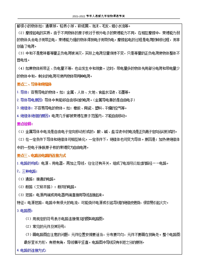 【内容简介】要点一、两种电荷1.电荷:物体有了吸引轻小物体的性质,我们说物体带了电,或带了电荷。2.摩擦起电:用摩擦的方法使物体带电,叫做摩擦起电。 3.正电荷:丝绸摩擦过的玻璃棒带的电荷叫正电荷。4.负电荷:毛皮摩擦过的橡胶棒上带的电荷叫负电荷。5.电荷作用规律:同种电荷互相排斥,异种电荷互相吸引。 6.验电器:(1)验电器的结构:金属球、金属杆、金属箔。(2)作用:检验物体是否带电。(3)原理:同种电荷互相排斥。(4)检验物体是否带电的方法:看是否可以吸引轻小物体;通过验电器;利用电荷间的相互作用。 7.原子结构 元电荷:(1)电荷量:电荷的多少叫做电荷量,简称电荷;单位:库仑,符号是C。(2)原子结构:物体由分子、原子构成,分子由原子构成,原子由原子核和核外电子构成,原子核由质子和中子构成。质子带正电,核外电子带负电,且质子数=核外电子数,则原子带的正电荷与负电荷等量,原子不显电性,呈电中性,物体也呈电中性,但不能说物体没有电荷。 (3)元电荷:精确的实验表明,任何带电体所带的电荷量总是等于某一个最小电荷量的整数倍,即电子所带电荷量的整数倍。因此人们把一个电子所带电荷量的绝对值叫“基本电荷”,也叫“元电荷”(带电量最小的电荷),用符号“e”表示,则e=1.6×10-19C。要点诠释:(1)带电体能够吸引轻小物体,这个吸引是相互的,轻小物体也会吸引带电体。轻小物体是指质量和体积都很小的物体如:通草球,轻质小球、碎纸屑、泡沫、毛发、细小水流等。(2)摩擦起电的实质,由于不同物体的原子核对于核外电子的束缚能力不同,在相互摩擦中,束缚能力弱的物体失去电子而带正电,束缚能力强的物体得到电子而带负电。摩擦起电的过程是电荷的转移过程,而非创造了电荷。(3)中和不是意味着等量正负电荷被消灭,实际上电荷总量保持不变,只是等量的正负电荷使物体整体不显电性。(4)如果物体所带正、负电量不等,也会发生中和现象。这时,带电量多的物体先用部分电荷和带电量少的物体中和,剩余的电荷可使两物体带同种电荷。要点二、导体和绝缘体1.导体:容易导电的物体。如:金属、人体、大地、食盐水溶液、石墨等。2.导体导电原因:导体中有能够自由移动的电荷。(金属导电靠的是自由电子)3.绝缘体:不容易导电的物体。如:橡胶、陶瓷、塑料、干燥的空气等。4.绝缘体绝缘的原因:电荷几乎都被束缚在原子范围内,不能自由移动。 要点诠释:(1)金属导体中电流是自由电子定向移动形成的,酸、碱、盐溶液中的电流是正负离子定向运动形成的。(2)在一定条件下导体和绝缘体可相互转化。一定条件下,绝缘体也可变为导体。原因是:加热使绝缘体中的一些电子挣脱原子核的束缚变为自由电荷。要点三、电路及电路的连接方式