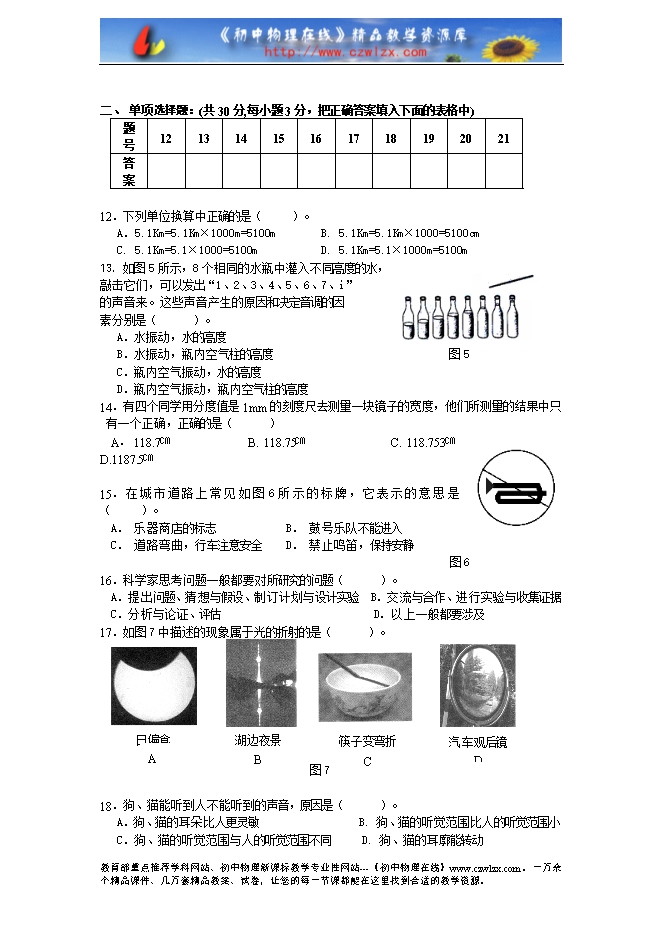 汫洲二中2010-2011学年第一学期八年级物理期中试卷及答案