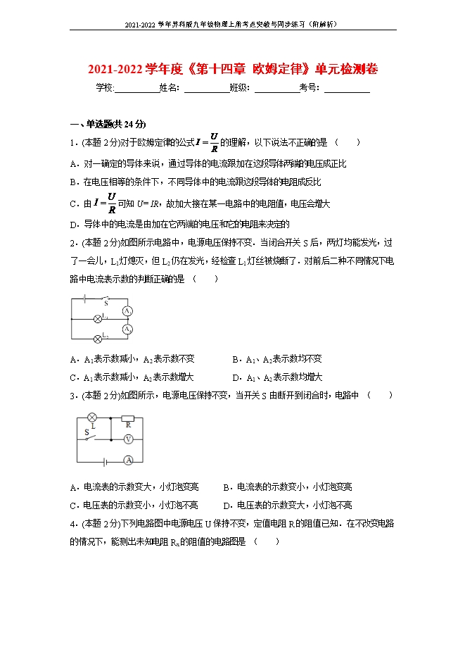 - 2232025-2026学年苏科版物理九年级上册同步练习:第十四章 欧姆定律 小专题1 欧姆定律在动态电路…