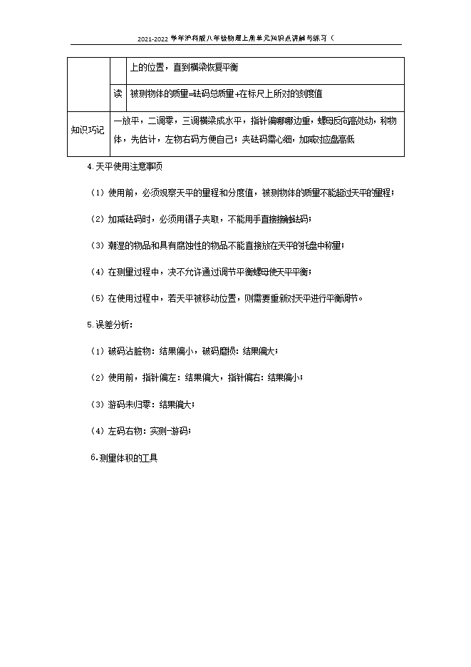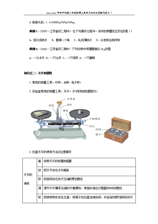 【内容简介】知识点一:质量1.在物理学中,把物体所含物质的多少叫物体的质量。质量符号:m2.质量是物体的基本属性,一切物体都有质量,它不随物体的形状,所处的空间位置,状态的变化而变化。3.基本单位:千克(kg),常用单位:吨(t),克(g),毫克(mg)4.换算关系:1 t=1000kg=106g=109mg典例1.(2020•江苏省初二期中)在下列操作过程中,铁块的质量发生变化的是()A.熔化成铁水B.磨掉一个角C.轧成薄铁片D.从地球运到月球【答案】B【解析】质量表示物体的量的多少,不随位置、温度、形状的变化而变化。A.铁块熔化成铁水是改变了铁的状态,铁块的质量不会变化。故A不符合题意;B.把铁块磨掉一个角,铁块的质量会变小。故B符合题意;C.铁块轧成薄铁片是改变了铁的形状,铁块的质量不会变化。故C不符合题意;D.铁块从地球运到月球是改变了铁块的位置,铁块的质量不会变化。故D不符合题意。典例2.(2020•江苏省初二期中)下列动物中质量最接近2kg的是A.一头水牛B.一只山羊C.一只母鸡D.一只蜜蜂【答案】C【解析】A.一头牛的质量很大,在200kg左右.不符合题意;B.一只山羊的质量大约60斤=30000g=30kg左右.不符合题意;C.一只老母鸡的质量大约4斤=2kg左右.符合题意;D.一只蜜蜂的质量非常小,在5g以下.不符合题意.知识点二:天平和量筒1.常用的测量工具:杆秤、台秤、电子秤。2.实验室常用的测量工具:天平。天平的构成如图所示: 3.托盘天平的使用方法及注意事项天平的使用看观察天平的称量和感量放把天平放在水平桌面移把游码放在标尺左端的零刻度线调调节天平横梁右端的平衡螺母,使指针指在分度盘的中央刻度线称把被测物体放在左盘,用镊子向右盘加减砝码,并适当的调节游码在标尺上的位置,直到横梁恢复平衡读被测物体的质量=砝码总质量+在标尺上所对的刻度值知识巧记一放平,二调零,三调横梁成水平,指针偏哪哪边重,螺母反向高处动,称物体,先估计,左物右码方便自己;夹砝码需心细,加减对应盘高低4.天平使用注意事项(1)使用前,必须观察天平的量程和分度值,被测物体的质量不能超过天平的量程;(2)加减砝码时,必须用镊子夹取,不能用手直接接触砝码;(3)潮湿的物品和具有腐蚀性的物品不能直接放在天平的托盘中称量;(4)在测量过程中,决不允许通过调节平衡螺母使天平平衡;(5)在使用过程中,若天平被移动位置,则需要重新对天平进行平衡调节。5.误差分析:(1)破码沾脏物:结果偏小,破码磨损:结果偏大;(2)使用前,指针偏左:结果偏大,指针偏右:结果偏小;(3)游码未归零:结果偏大;(4)左码右物:实测-游码;6.测量体积的工具