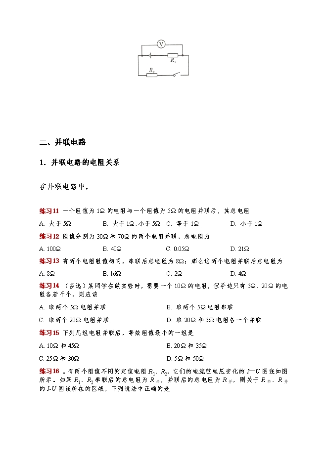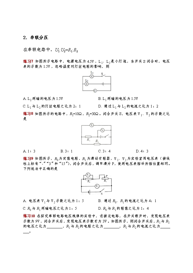 【内容简介】1.串联电路中电阻的关系在串联电路中,R总=R1+R2+…练习1 串联电路中,总电阻等于串联电路中各分电阻之和。有两个阻值分别为R1=6Ω和R2=3Ω的电阻,串联在电路中,总电阻为A. 6ΩB. 3ΩC. 2ΩD. 9Ω练习2 电路中有一根电阻丝,若要使电路中的电阻变大,可以采取的方法是A. 串联一根相同的电阻丝B. 并联一根相同的电阻丝C. 增大电路两端的电压D. 减小电路中的电流练习3 现有几个阻值为10Ω的电阻,电路中需要一个50Ω的电阻,至少应将 5 个10Ω的电阻 串 联。练习4 电阻R1与一个40Ω的电阻R2串联后,它们的总电阻是100Ω(如图所示),则R1的阻值是 60 Ω,如果在A、B两端接上60V的电压,则通过R1的电流是 0.6 A。 练习5 如图所示,R1、R2串联在电路中,R1的阻值为5Ω,R2的阻值为10Ω,电源电压为6V。求: (1)R1、R2的总电阻;(2)电路中的电流;(3)R1、R2两端的电压。练习6 如图所示,R1、R2串联在电路中,R1的阻值为5Ω,R2的阻值为5Ω,电源电压为9V。求:R1、R2两端的电压。 2.串联分压在串联电路中,U1:U2=R1:R2练习7 如图所示电路中,电源电压为4.5V,L1、L2是小灯泡,当开关S闭合时,电压表的示数为1.5V,忽略温度对灯丝电阻的影响,则 A. L2两端的电压为1.5VB. L1两端的电压为1.5VC. L1与L2的灯丝电阻之比为2:1D. 通过L1与L2的电流之比为1:2练习8 如图所示的电路中,R1=10Ω,R2=30Ω。闭合开关S,电压表V1、V2的示数之比是 A. 1:3B. 3:1C. 3:4D. 4:3练习9 如图所示,R0为定值电阻,R1为滑动变阻器,V1、V2为实验室用电压表(接线柱上标有“-”“3”和“15”),闭合开关后,调节滑片P,使两电压表指针所指位置相同。下列说法中正确的是 A. 电压表V1与V2示数之比为1:5B. 通过R0、R1的电流之比为4:1C. R0与R1两端电压之比为1:5D. R0与R1的阻值之比为1:4练习10 在探究串联电路电压规律的实验中,连接完电路,在开关断开时,发现电压表示数为9V,闭合开关后,发现电压表示数变为3V。如图所示,则闭合开关后,R1与R2的电压之比为 2:1 ,R1与R2的电阻之比为 2:1 ,R1与R2的电流之比为 1:1 。
