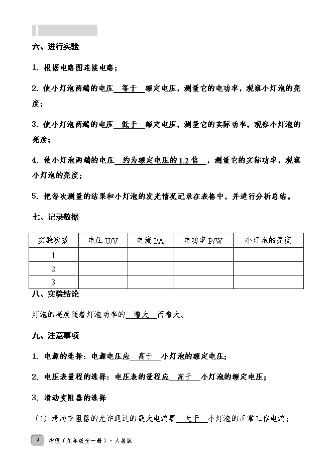 【内容简介】一、实验目的探究小灯泡的 亮度 与小灯泡的 功率 有什么关系?二、实验原理 P=UI 三、实验器材电源、小灯泡(额定电压为2.5V)、 滑动变阻器 、 电压表 、 电流表 、开关、导线。四、实验电路 五、进行实验1.依照电路图连接实物电路。 六、进行实验1.根据电路图连接电路;2.使小灯泡两端的电压 等于 额定电压,测量它的电功率,观察小灯泡的亮度;3.使小灯泡两端的电压 低于 额定电压,测量它的实际功率,观察小灯泡的亮度;4.使小灯泡两端的电压 约为额定电压的1.2倍 ,测量它的实际功率,观察小灯泡的亮度;5.把每次测量的结果和小灯泡的发光情况记录在表格中,并进行分析总结。七、记录数据实验次数电压U/V电流I/A电功率P/W小灯泡的亮度123八、实验结论灯泡的亮度随着灯泡功率的 增大 而增大。九、注意事项1.电源的选择:电源电压应 高于 小灯泡的额定电压;2.电压表量程的选择:电压表的量程应 高于 小灯泡的额定电压;3.滑动变阻器的选择