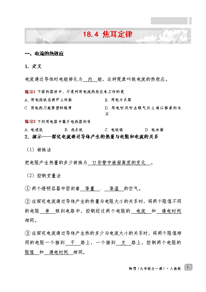 【内容简介】一、电流的热效应1.定义电流通过导体时电能转化为 内 能,这种现象叫做电流的热效应。练习1 下面的器材中,不是利用电流热效应来工作的是A. 用电烙铁在葫芦上作画B. 用电斗衣服C. 用电热刀裁剪塑料绳带D. 用电吹风吹去暖气片上难以够着的灰尘练习2 下列用电器中属于电热器的有A. 电视机B. 洗衣机C. 电饭锅D. 电冰箱2.演示——探究电流通过导体产生的热量与电阻和电流的关系(1)转换法把电阻产生热量的多少转换为 U形管中液面高度的变化 。(2)控制变量法① 两个透明容器中密封着 等量 、 等温 的空气。② 在探究电流通过导体产生的热量与电阻大小的关系时,将两个阻值不同的电阻 串 联到电路中,控制经过两个电阻的 电流 和 通电时间 相同。③ 在探究电流通过导体产生热的多少与电流大小的关系时,将两个阻值相同的电阻一个接到 干 路上,一个接到 支 路上,控制两个电阻的 阻值 和 通电时间 相同。练习3 小明利用图所示的实验装置探究“导体产生的热量与电阻大小的关系”。甲、乙两瓶中装有质量与初温都相同的煤油,甲瓶中铜丝的电阻比乙瓶中镍铬合金丝的电阻小。 (1)实验中煤油吸热的多少是通过 温度计示数 来反映的(选填“温度计示数”或“加热时间”);(2)为了在较短的时间内达到明显的实验效果,小明选用煤油而不用水做实验,是因为煤油的比热容 小于 水的比热容。(选填“大于”或“小于”);(3)通电一定时间后,乙瓶中的温度计示数升高的快,由此得出的实验结论是 在电流和通电时间相同时,导体的电阻越大,产生的热量越多 ;(4)该实验中用到的研究物理问题的法是 控制变量法和转换法 。练习4 物理兴趣小组的同学正在进行“探究电流通过导体产生的热量与什么因素有关”的实验。他们将一段电阻丝装在透明、密闭的容器中,橡胶管将密闭容器和装有红色液体的U形玻璃管相连,如图所示。请你回答下列问题:
