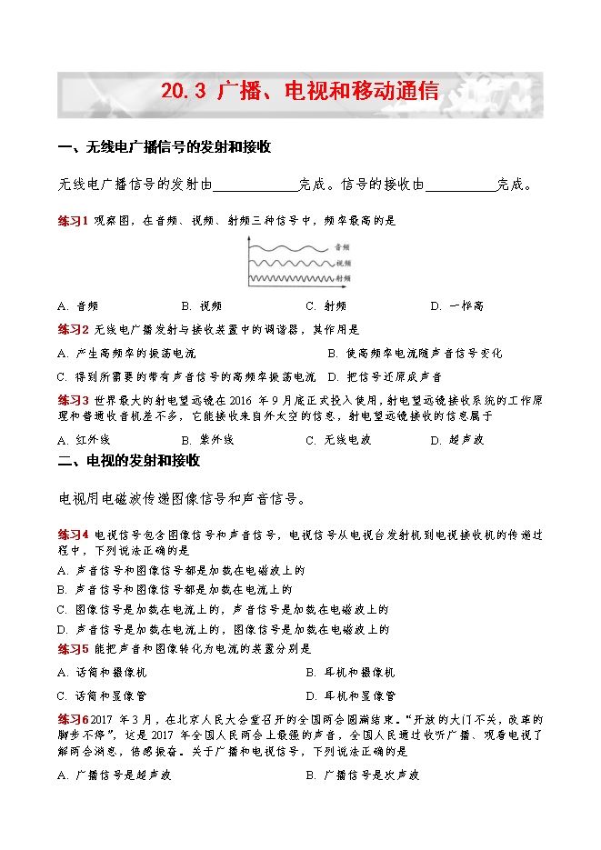 【内容简介】一、无线电广播信号的发射和接收无线电广播信号的发射由 广播电台 完成。信号的接收由 收音机 完成。练习1 观察图,在音频、视频、射频三种信号中,频率最高的是A. 音频B. 视频C. 射频D. 一样高练习2 无线电广播发射与接收装置中的调谐器,其作用是A. 产生高频率的振荡电流B. 使高频率电流随声音信号变化C. 得到所需要的带有声音信号的高频率振荡电流D. 把信号还原成声音练习3 世界最大的射电望远镜在2016年9月底正式投入使用,射电望远镜接收系统的工作原理和普通收音机差不多,它能接收来自外太空的信息,射电望远镜接收的信息属于A. 红外线B. 紫外线C. 无线电波D. 超声波二、电视的发射和接收电视用电磁波传递图像信号和声音信号。练习4 电视信号包含图像信号和声音信号,电视信号从电视台发射机到电视接收机的传递过程中,下列说法正确的是A. 声音信号和图像信号都是加载在电磁波上的B. 声音信号和图像信号都是加载在电流上的C. 图像信号是加载在电流上的,声音信号是加载在电磁波上的D. 声音信号是加载在电流上的,图像信号是加载在电磁波上的练习5 能把声音和图像转化为电流的装置分别是A. 话筒和摄像机B. 耳机和摄像机C. 话筒和显像管D. 耳机和显像管练习6 2017年3月,在北京人民大会堂召开的全国两会圆满结束。“开放的大门不关,改革的脚步不停”,这是2017年全国人民两会上最强的声音,全国人民通过收听广播、观看电视了解两会消息,倍感振奋。关于广播和电视信号,下列说法正确的是A. 广播信号是超声波B. 广播信号是次声波C. 电视信号是电磁波D. 电视信号是激光练习7 2013年6月15日,天宫一号内的航天员面向全国青少年开展了科普教育活动。如图所示,位于北京地面课堂内的小明同学通过大屏幕观看太空授课直播。太空向地面传输的图像信号和声音信号的载体是