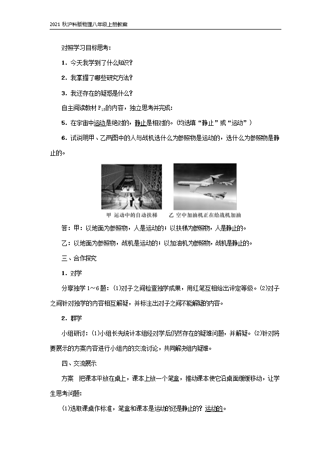 2021秋沪科版物理八年级上册第2章《2.1 动与静》教案