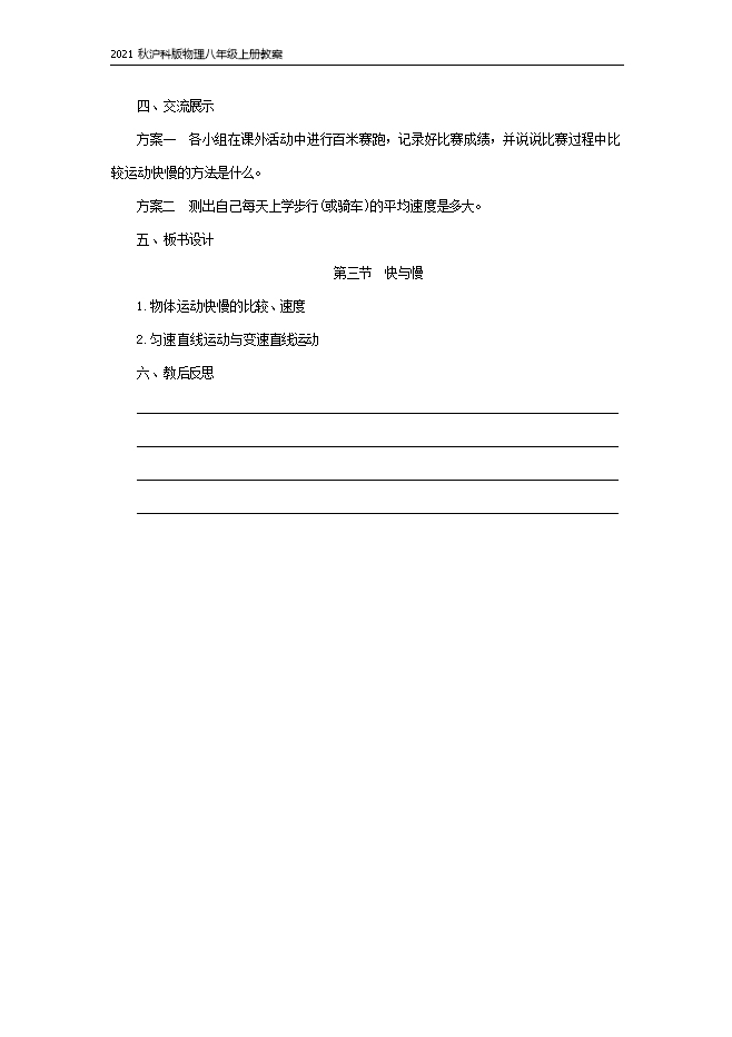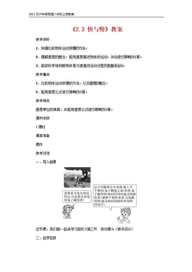 2021秋沪科版物理八年级上册第2章《2.3 快与慢》教案