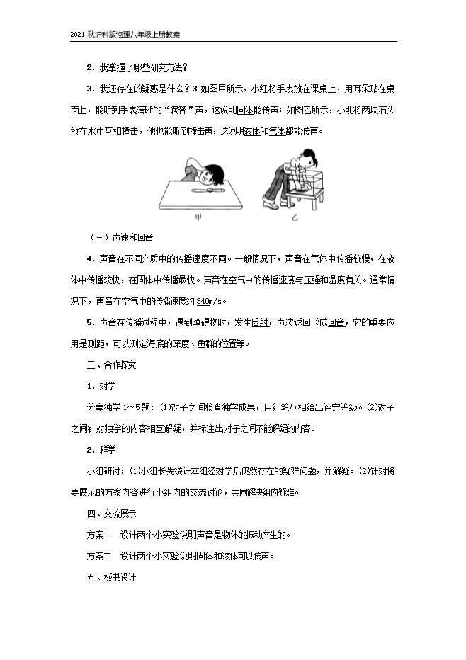 【内容简介】教学目标1.知道自然是神奇的,了解人类探索科学的意义,了解科学探究的主要环节。2.能说出什么是机械运动,并能根据参照物来判断物体的运动状态。3.能正确使用刻度尺测量物体的长度,会正确使用手表或停表测时间。4.会利用v=st分析简单的物体运动情况,初步学会探究问题的思路和方法。教学重点进一步探究关于运动的相关知识。教学难点系统掌握全章知识,形成知识结构。课时安排1课时课前准备课件教学过程一、导入新课对照复习目标,回顾第二章知识要点,想想自己对哪些知识的掌握还不够熟练?这节课,我们就一起来研究复习《第二章 运动的世界》的相关知识。(板书课题)二、自学互研(一)物理世界的认识与探索1.彩虹是一种美丽的自然现象,它常出现在( C )A.阴天 B.下雨之前 C.雨后初晴 D.下雨时2.体育课掷铅球活动后,同学们对“铅球”的制作材料进行讨论,有同学认为“铅球”是铁制的,并从实验室借来磁铁吸一下。“吸一下”这一过程属于科学探究中的( C )A.提问 B.猜想 C.实验 D.得出结论方法指导:运动和静止的判断:若物体相对于参照物位置发生了变化,则物体就是运动的;若未发生变化,则物体就是静止的。归纳总结:1.读取被测长度时,应估读到分度值的下一位,若该数位上无数,则应补零。2.机械停表的读数方法:分别读出(小盘转一圈为15min)和秒(大盘转一圈为30s),并将它们相加。独立完成知识板块一、二、三、四;教师巡视,根据完成情况挑选几组同学带领大家分别学习知识板块一、二、三、四。其他同学补充或纠错。友情提醒:平均速度具有区间性,不同路段的平均速度一般不同。组织好方案一、二的探究活动,各组学生回顾并思考,小组长汇总讨论结果,教师巡视各小组讨论情况,选择较好的两组在全班进行展示,师生共同评估,得出一致性的结论。对照复习目标思考:1.今天我学到了什么知识?2.我掌握了哪些研究方法?3.我还存在的疑惑是什么?