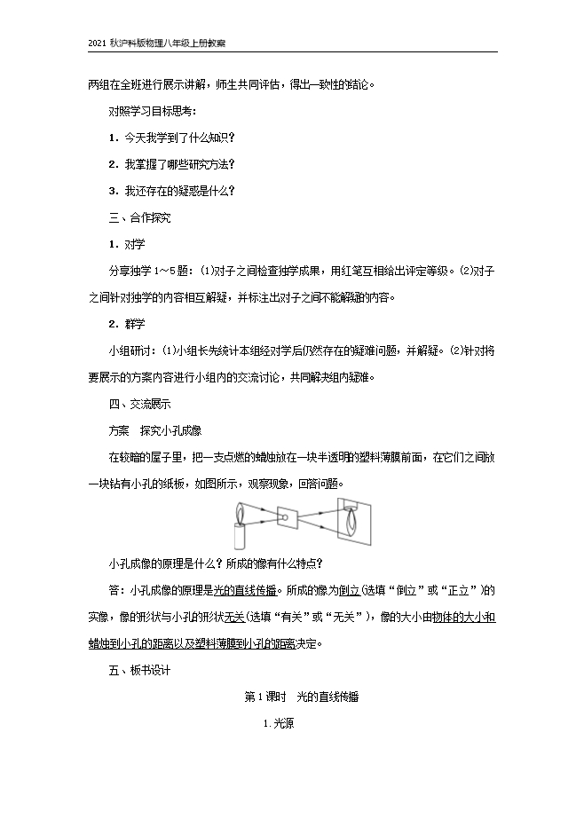【内容简介】第1课时 光的直线传播一、导入新课这节课,我们就一起来学习探究《第1课时 光的直线传播》。(板书设计)二、自学互研(一)光源自主阅读教材P53的内容,独立思考并完成:1.能本身发光的物体称为光源,从光源发出的光进入我们的眼睛,我们便看见了这个发光体。2.如图所示的四幅图中,属于光源的是( C )(二)光的直线传播自主阅读教材P53~54的内容,独立思考并完成:3.光的直线传播(1)光在同一种均匀介质中是沿直线传播的。(2)光的直线传播现象:小孔成像、月食的形成、影子的形成等。(3)我们引入“光线”来表示光的传播,光线不是真实存在的,而是为了研究方便假想的理想模型。4.光速光在真空中的传播速度c=3×108m/s;光在空气中的传播速度约为3×108m/s;光在水中的传播速度约为真空中速度的34;在玻璃中的速度约为真空中速度的23。光年是光在一年里传播的距离,因此光年是长度单位。5.在暗室中,将一束激光分别射入空气、水中,观察光在空气、水中的传播路径(如甲、乙两图所示),得出的结论是光在同一种均匀介质中沿直线传播。这一结论在生活或生产中的应用很多,请举一例:激光瞄准。 独立完成知识板块一、二,教师巡视,根据完成情况挑选3组同学带领大家分别学习知识板块一、二。其他同学补充或纠错。给每组分发器材,组织好方案的探究活动,学生观察发生的现象并讨论其原因,选择两组在全班进行展示讲解,师生共同评估,得出一致性的结论。对照学习目标思考:1.今天我学到了什么知识?2.我掌握了哪些研究方法?3.我还存在的疑惑是什么?三、合作探究1.对学分享独学1~5题:(1)对子之间检查独学成果,用红笔互相给出评定等级。(2)对子之间针对独学的内容相互解疑,并标注出对子之间不能解疑的内容。2.群学小组研讨:(1)小组长先统计本组经对学后仍然存在的疑难问题,并解疑。(2)针对将要展示的方案内容进行小组内的交流讨论,共同解决组内疑难。四、交流展示方案 探究小孔成像在较暗的屋子里,把一支点燃的蜡烛放在一块半透明的塑料薄膜前面,在它们之间放一块钻有小孔的纸板,如图所示,观察现象,回答问题。