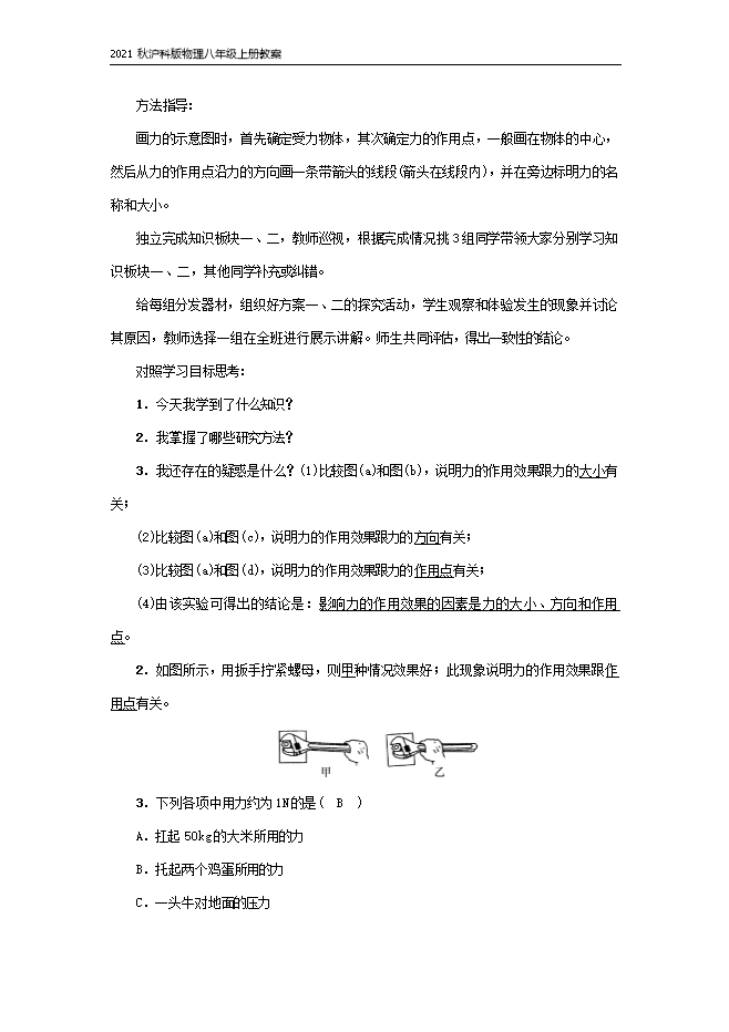 【内容简介】一、导入新课这节课,我们就一起来学习探究《第二节 怎样描述力》。(板书设计)二、自学互研(一)力的三要素、力的单位自主阅读教材P105~106的内容,独立思考并完成:1.如图所示,使一薄钢条的下端固定,分别用不同的力去推它,使其发生图(a)、(b)、(c)、(d)所示的形变,其中F1=F3=F4>F2,那么: 方法指导:画力的示意图时,首先确定受力物体,其次确定力的作用点,一般画在物体的中心,然后从力的作用点沿力的方向画一条带箭头的线段(箭头在线段内),并在旁边标明力的名称和大小。独立完成知识板块一、二,教师巡视,根据完成情况挑3组同学带领大家分别学习知识板块一、二,其他同学补充或纠错。给每组分发器材,组织好方案一、二的探究活动,学生观察和体验发生的现象并讨论其原因,教师选择一组在全班进行展示讲解。师生共同评估,得出一致性的结论。对照学习目标思考:1.今天我学到了什么知识?2.我掌握了哪些研究方法?3.我还存在的疑惑是什么?(1)比较图(a)和图(b),说明力的作用效果跟力的大小有关;(2)比较图(a)和图(c),说明力的作用效果跟力的方向有关;(3)比较图(a)和图(d),说明力的作用效果跟力的作用点有关;(4)由该实验可得出的结论是:影响力的作用效果的因素是力的大小、方向和作用点。2.如图所示,用扳手拧紧螺母,则甲种情况效果好;此现象说明力的作用效果跟作用点有关。 3.下列各项中用力约为1N的是( B )A.扛起50kg的大米所用的力B.托起两个鸡蛋所用的力C.一头牛对地面的压力