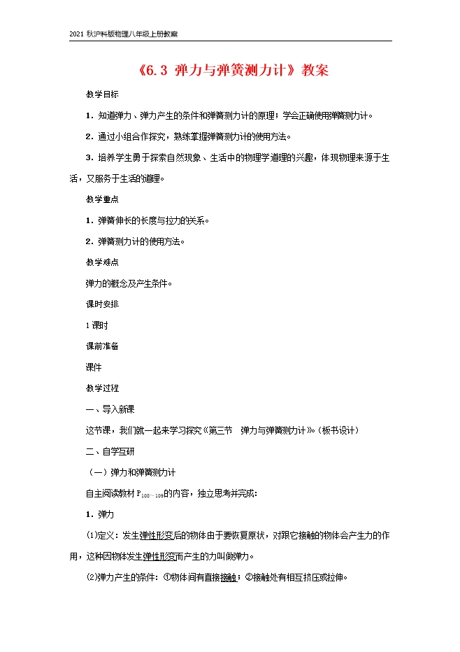2021秋沪科版物理八年级上册第6章《6.3 弹力与弹簧测力计》教案