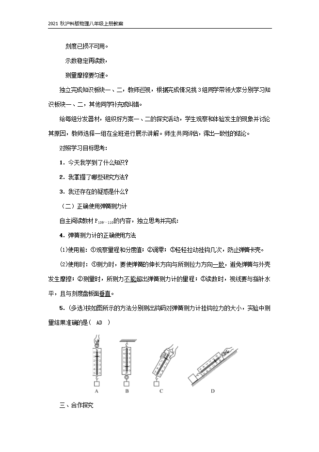 【内容简介】一、导入新课这节课,我们就一起来学习探究《第三节 弹力与弹簧测力计》。(板书设计)二、自学互研(一)弹力和弹簧测力计自主阅读教材P108~109的内容,独立思考并完成:1.弹力(1)定义:发生弹性形变后的物体由于要恢复原状,对跟它接触的物体会产生力的作用,这种因物体发生弹性形变而产生的力叫做弹力。(2)弹力产生的条件:①物体间有直接接触;②接触处有相互挤压或拉伸。(3)弹力的方向:支持面的弹力方向总是与支持面垂直,细绳的弹力方向总是沿着绳绷紧的方向,且与使它们发生形变的方向相反。2.弹簧测力计(1)作用:测量力的大小。(2)构造:弹簧、挂钩、指针和刻度盘等部分(如图所示)。(3)原理:在弹性范围内,弹簧受到的拉力越大,弹簧的伸长越长。 (第2题图) (第3题图)3.如图所示的弹簧测力计,量程是0~5N,由此,挂钩上受到的拉力不得超过5N,否则测力计会损坏;它的分度值是0.2N。若作用在挂钩上的拉力为F1时,指针恰好指在A处,那么F1的大小是1.4N,若指针指在B处,那么作用在挂钩上的拉力F2的大小是3.6N。方法指导:弹簧测力计的使用巧记口诀: 物重不得超量程, 读数视线要垂直。 测量之前先调零,