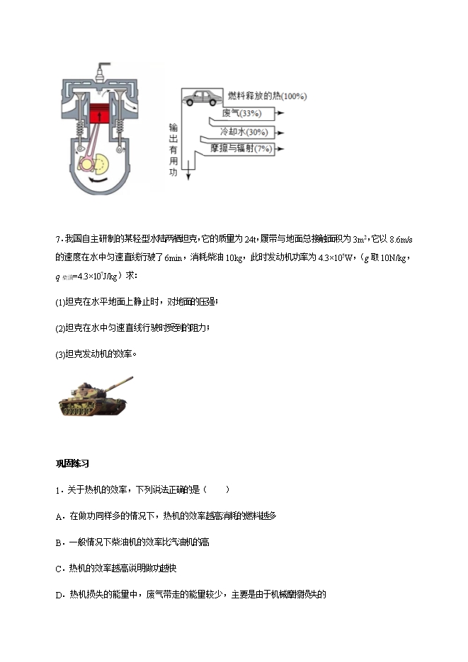 【内容简介】知识点二、热机与环境5.随着人们的生活水平的提高,汽车走进千家万户。关于小汽车涉及的知识说法正确的是A.汽车用水来做冷却剂是因为水的比热容较大B.发动机做功冲程将机械能转化为内能C.精心保养可使发动机的效率达到100%D.排出的尾气对环境没有任何污染6.深圳市比亚迪汽车公司已成为全国知名汽车品牌,其生产的燃油汽车工作时是将燃油燃烧时产生的_________能转化为机械能,一个工作循环往往由四个冲程构成,请你判断图中表示的是________冲程。燃油汽车工作时用于给气缸冷却的冷却剂温度会升高,内能会增大,这是利用___________方式改变了冷却剂的内能。小明同学在参观比亚迪汽车公司博物馆时发现了一张早期内燃机的能量流向图表,请根据该图表中给出的信息,计算该内燃机的效率为___________。为提高效率促进环保降低碳排放,比亚迪汽车公司是全世界较早开始研发电动汽车的公司,其生产的纯电动汽车广受市场欢迎,在给纯电动汽车充电时是_______能转化成________能。 7.我国自主研制的某轻型水陆两栖坦克,它的质量为24t,履带与地面总接触面积为3m2,它以8.6m/s的速度在水中匀速直线行驶了6min,消耗柴油10kg,此时发动机功率为4.3×105W,(g取10N/kg,q柴油=4.3×107J/kg)求:(1)坦克在水平地面上静止时,对地面的压强;(2)坦克在水中匀速直线行驶时受到的阻力;(3)坦克发动机的效率。 巩固练习1.关于热机的效率,下列说法正确的是( )A.在做功同样多的情况下,热机的效率越高消耗的燃料越多B.一般情况下柴油机的效率比汽油机的高C.热机的效率越高说明做功越快D.热机损失的能量中,废气带走的能量较少,主要是由于机械摩擦损失的