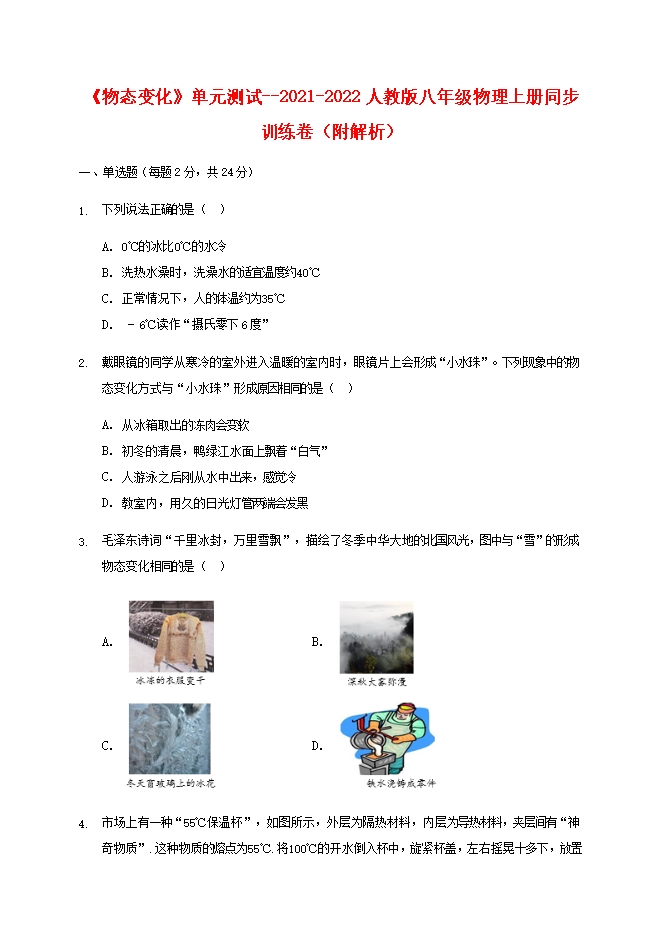 【内容简介】下列说法正确的是( )A. 0℃的冰比0℃的水冷B. 洗热水澡时,洗澡水的适宜温度约40℃C. 正常情况下,人的体温约为35℃D. -6℃读作“摄氏零下6度”戴眼镜的同学从寒冷的室外进入温暖的室内时,眼镜片上会形成“小水珠”。下列现象中的物态变化方式与“小水珠”形成原因相同的是( )A. 从冰箱取出的冻肉会变软B. 初冬的清晨,鸭绿江水面上飘着“白气”C. 人游泳之后刚从水中出来,感觉冷D. 教室内,用久的日光灯管两端会发黑毛泽东诗词“千里冰封,万里雪飘”,描绘了冬季中华大地的北国风光,图中与“雪”的形成物态变化相同的是( )A. B. C. D. 市场上有一种“55℃保温杯”,如图所示,外层为隔热材料,内层为导热材料,夹层间有“神奇物质”.这种物质的熔点为55℃.将100℃的开水倒入杯中,旋紧杯盖,左右摇晃十多下,放置约1min后拧开杯盖,杯中原本的开水快速降温至可饮用的温水.当水喝完后,再将凉水倒入杯中,旋紧杯盖,同样左右摇晃十多下,约1min后再拧开杯盖,杯中原本的凉水也会快速升温至可饮用的温水,下列解释不正确的是( )A. 倒入开水时,该物质熔化吸热,使开水的温度降低B. 倒入冷水时,该物质凝固放热,使冷水的温度升高C. 该物质的温度为55℃时,物质一定是固态D. 杯子先倒入冷水,冷水不能变热下列是对我们生活中常见的一些热现象的解释,其中正确的是( )A. 冬天清晨花草上的霜是凝固而形成的B. 衣柜里的樟脑丸变小是因为樟脑丸蒸发了C. 冬天在菜窖里放几桶水,利用水凝固放热防止菜被冻坏D. 发烧时在身体上擦些酒精降温是因为酒精的温度低关于温度计,下列说法中正确的是( )A. 液体温度计的原理是根据液体热胀冷缩的性质制成的B. 常用温度计把冰的温度定为0℃C. 常用温度计把冰的温度定为100℃D. 常用温度计内的液体通常用水有一支刻度模糊不清的温度计,将它插在标准大气压下的冰水混合物中时,水银柱的长度为4厘米,将它插在标准大气压下的沸水中时,水银柱的长度为24厘米。当将此温度计插在某液体中时,水银柱的长度为14厘米,则此液体的温度是多少?( )A. 60℃B. 65℃C. 50℃D. 40℃
