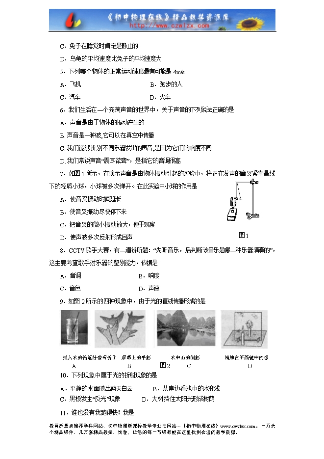 4.你一定听说过《龟兔赛跑》的寓言故事吧?乌龟和兔子同时从起点跑出,兔子在远远超过乌龟后,便骄傲地睡大觉。当它睡醒后才发现:乌龟已经爬到了终点。关于这个赛跑过程,下列说法正确的是