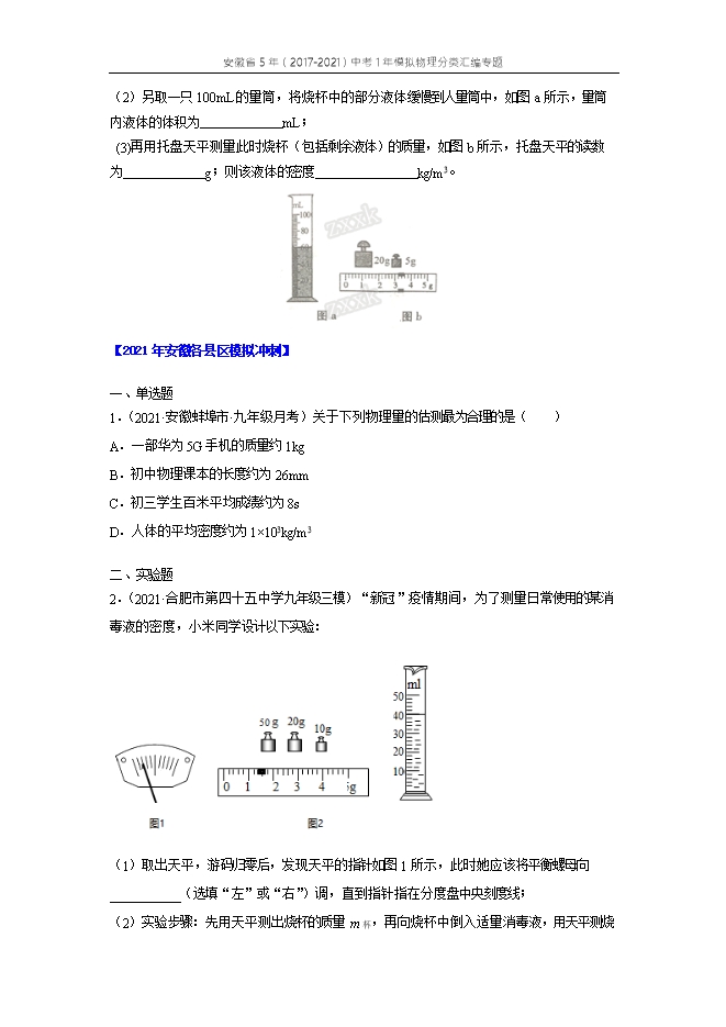 【内容简介】【近五年中考真题赏析】1.(2020安徽)实验室用的托盘天平,砝码盒中常配备的砝码规格有∶100g、50g、20g、10g、5g。现要测量一物体的质量(约为70g)。(1)调节横梁平衡∶将天平放在水平桌面上,取下两侧的垫圈,指针就开始摆动。稳定后指针指在分度盘的位置如图甲所示。则接下来的调节过程为∶________。(2)调节天平横梁平衡后,将物体放在左盘中,用镊子由大到小在右盘中加减砝码……,当放入5g的砝码时,指针偏向分度盘的右侧,如图乙所示。则接下来的操作是________,直到横梁恢复平衡。【答案】 (1). 游码归零,调节平衡螺母至指针指在分度盘中央 (2). 取下5g砝码,向右缓慢移动游码【解析】【详解】(1)[1]调节横梁平衡∶将天平放在水平桌面上,取下两侧的垫圈,指针就开始摆动。稳定后指针指在分度盘的位置,游码未归零,且指针偏右,故接下来的调节过程为∶游码归零,调节平衡螺母至指针指在分度盘中央。(2)[2]调节天平横梁平衡后,将物体放在左盘中,用镊子由大到小在右盘中加减砝码……,当放入5g的砝码时,指针偏向分度盘的右侧,但5g砝码为可用的最小砝码,故接下来的操作是取下5g砝码,向右缓慢移动游码,直到横梁恢复平衡。2.(2019安徽)完成下列单位换算:(1)19.3g/cm3=_______kg/m3;(2)5kW·h=___________J【答案】 (1). 1.93 ×104 (2). 1.8 ×107【解析】【详解】(1)因为 ,所以, ;(2)因为 ,所以, .3.(2019安徽)小明使用天平测小石块的质量.测量前他将天平放在水平桌面上,然后进行天平横梁平衡的调节.调节完成后指针静止时的位置和游码的位置如图甲所示. (1)请你指出小明调节天平横梁平衡的过程中遗漏的操作步骤:___________________(2)完成遗漏的操作步骤后,为了调节横梁平衡,他需向______(选填“左”或“右”)调节平衡螺母使指针指到分度盘中央刻度线或在中央刻度线两侧等幅摆动;(3)调节横梁平衡后,小明将小石块放在左盘,在右盘中加减砝码并调节游码在标尺上的位置,直到横梁恢复平衡.这时右盘中的砝码情况和游码在标尺上的位置如图乙所示,则小石块的质量为___g【答案】 (1). 游码调零 (2). 右 (3). 78.4【解析】【详解】(1)使用天平时,应先把游码移到标尺的零刻度线处,即游码归零,再调节平衡螺母使天平平衡,而小明调节天平横梁平衡的过程中遗漏了游码归零这一步骤.(2)甲图中没有将游码移至零刻度线,横梁就平衡了,如果将游码调零,则指针会偏向分度盘左侧,此时要使横梁平衡,则应将平衡螺母向右调节;(3)由图知,小石块的质量m=50g+20g+5g+3.4g=78.4g.4.(2017安徽)同学们通过以下实验步骤测量未知液体的密度:(1)取一只烧杯,向其中倒入适量的待测液体,用托盘天平测出此时烧杯(包括其中的液体)的质量为76.4g;(2)另取一只100mL的量筒,将烧杯中的部分液体缓慢到人量筒中,如图a所示,量筒内液体的体积为 mL; (3)再用托盘天平测量此时烧杯(包括剩余液体)的质量,如图b所示,托盘天平的读数为 g;则该液体的密度 kg/m3。 【答案】60 28.2 803.3【解析】试题分析:(1)如图a所示,量筒内液体的体积为V=60mL,(2)如图b所示,托盘天平的读数为m剩=20g+5g+3.2g=28.2g,(3)由密度公式可得该液体的密度 考点:密度的测量【2021年安徽各县区模拟冲刺】一、单选题1.(2021·安徽蚌埠市·九年级月考)关于下列物理量的估测最为合理的是( )A.一部华为5G手机的质量约1kgB.初中物理课本的长度约为26mmC.初三学生百米平均成绩约为8sD.人体的平均密度约为1×103kg/m3【答案】D【分析】首先对题目中涉及的物理量有个初步的了解,对于选项中的单位,可根据需要进行相应的换算或转换,排除与生活实际相差较远的选项,找出符合生活实际的答案。【解析】A.一包方便面的质量约100g,一部华为5G手机的质量与此差不多,则