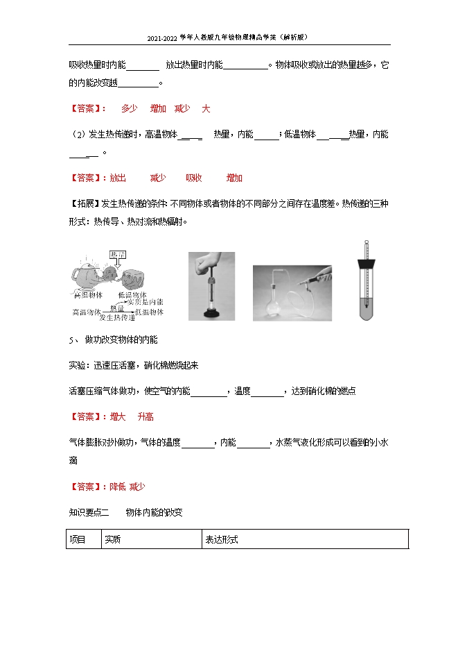 【内容简介】一、学习目标 1.了解内能的概念;能简单地描述温度和内能的关系 。 2.知道热传递可以改变物体的内能;知道热量的概念及单位 。 3.知道做功可以改变物体的内能。 4.学会区分温度、热量、内能;理解做功和热传递在改变物体的内能上是等效的 。 二、学习过程 一)、知识点梳理-------- 内能 1、构成物体的所有分子,其热运动的_______与___________的总和,叫作物体的内能。内能的单位是________,符号________。 【答案】: 动能 分子势能 焦耳 J 2.内能与机械能的比较 机械能与整个物体的____________情况(如运动的快慢、高度、位置等)有关 【答案】:机械运动 内能与物体内部分子的__________和分子之间的_____________情况有关,内能是不同于机械能的另一种形式的能 【答案】:热运动 相互作用 3、 物体,不论温度高低,都具有内能。物体温度降低时内能 ,温度升高时内能 。 【答案】: 一切 减少 增加 4、1.热传递改变物体的内能 (1)热量:热传递过程中,传递能量的 叫作热量,单位:焦耳(J)。物体吸收热量时内能________ 放出热量时内能 。物体吸收或放出的热量越多,它的内能改变越 。 【答案】: 多少 增加 减少 大 (2)发生热传递时,高温物体___ _ 热量,内能______;低温物体___ __热量,内能_____ 。 【答案】:放出 减少 吸收 增加 【拓展】发生热传递的条件:不同物体或者物体的不同部分之间存在温度差。热传递的三种形式:热传导、热对流和热辐射。 5、 做功改变物体的内能 实验:迅速压活塞,硝化棉燃烧起来 活塞压缩气体做功,使空气的内能_________,温度________,达到硝化棉的燃点 【答案】:增大 升高 气体膨胀对外做功,气体的温度________,内能________,水蒸气液化形成可以看到的小水滴 【答案】:降低 减少 知识要点二 物体内能的改变 项目实质表达形式热传递内能的转移(由高温物体转移到低温物体)凡是带有“热得”“晒得”“暖手”“加热”“遇冷”等词语来描述物体温度变化的情景为热传递做功其他形式的能量(主要是机械能)与内能之间的转化凡是带有“压缩”“摩擦”“锻打”“拧弯”“钻木”等词语来描述运动形式的情景为做功