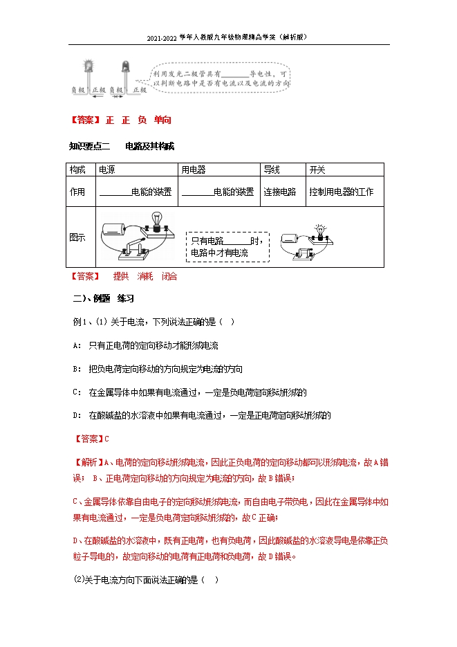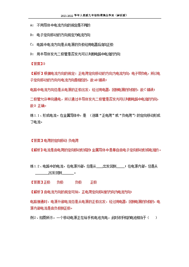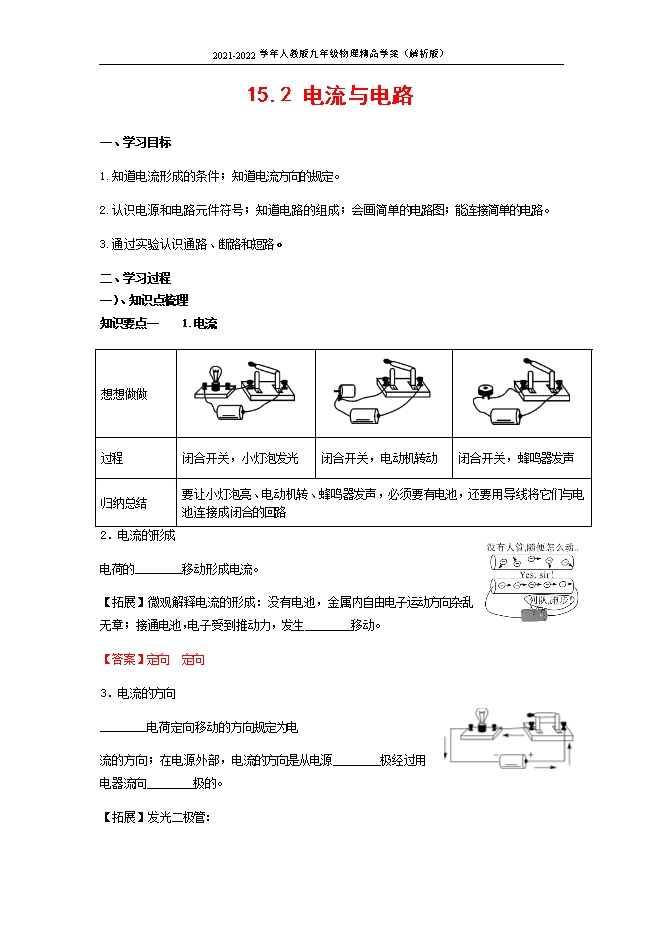 2021-2022学年人教版九年级物理精品学案:15.2 电流与电路(解析版)