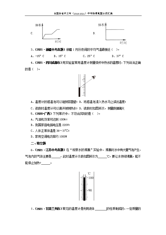 【内容简介】1.(2020•黄石)物理学在生活中的应用无处不在,我们要成为“物理知识”的好朋友,下列估测正确的是( )。A.人步行的速度大约是15m/s;B.人体感觉温暖又舒适的房间温度大约23℃;C.人体电阻大约100Ω;D.中学生身高大约160dm【答案】B。【解析】A、人正常步行的速度在4km/h=4× m/s≈1.1m/s左右,故A不正确;B、人体正常体温在37℃左右,感觉舒适的温度在23℃左右,故B正确;C、正常情况下,人体电阻在几千欧左右,故C不正确;D、成年人的身高在170cm左右,中学生的身高略小于成年人,在160cm=16dm左右,故D不正确。故选:B。2.(2019•广州)在图温度计所示的恒温环境下进行实验.将温度计放入一杯冰水混合物中(冰是晶体),从温度计放入开始计时,放入时间足够长,下列哪幅示意图可能反映了温度计内液体的体积随时间变化的情况( )。 A. B. C. D. 【答案】A。【解析】由图知,当时环境温度始终为25℃,而冰水混合物的温度为0℃,当把温度计放入冰水混合物中时,温度计的示数先下降,则温度计内的液体的体积先减小,然后温度计的示数保持0℃不变,则即温度计内液体的体积保持不变,待冰完全熔化后,水的温度又开始上升直至与环境温度相同即为25℃,这个过程对应温度计的示数变化是由0℃变成25℃,最后不变,即温度计内液体的体积先变大后不变,可见,从计时开始,温度计内液体的体积的变化情况是:先变小后不变,再变大后不变。故应选A。3.(2021•新疆中考真题)新疆1月份夜间的平均气温最接近( )。A.-15°CB.15°CC.25°CD.37°C【答案】A。【解析】新疆1月份夜间的气温较低,平均约为零下15摄氏度,故A符合题意,BCD不符合题意。故选A。4.(2021•四川成都市)用实验室常用温度计测量烧杯中热水的温度时,下列说法正确的是( )。 A.温度计的感温泡可以碰到容器壁;B.将感温泡浸入热水马上读出温度;C.读数时温度计可以离开被测热水;D.读数时如图所示,测量数据偏大【答案】D。【解析】A.温度计感温泡不可以碰到容器底或容器壁,否则会造成所测温度不准确,故A错误;B.将感温泡浸没热水后,应待温度计示数稳定后,再读数,故B错误;C.读数时温度计不应离开热水来读数,否则会造成读数有偏差,故C错误;D.读数时,视线应与刻度值保持水平,图中俯视读数或导致测量结果偏大,故D正确。故选D。5.(2020•广西)下列常识中,不符合实际的是( )。A.汽油机效率可达到100%;B.我国家庭电路电压是220V;C.人体正常体温是36~37℃;D.家用空调电功率约1000W【答案】A。【解析】A、热机的效率比较低,汽油机效率在30%左右。故A不符合实际;B、我国家用电器额定电压为220V,与之配套的家庭电路电压也是220V,保证用电器正常工作。故B符合实际;C、人的正常体温在36~37℃之间,变化幅度很小。故C符合实际;D、家用空调工作电流在4.5A左右,其功率在P=UI=220V×4.5A≈1000W左右。故D符合实际。故选:A。