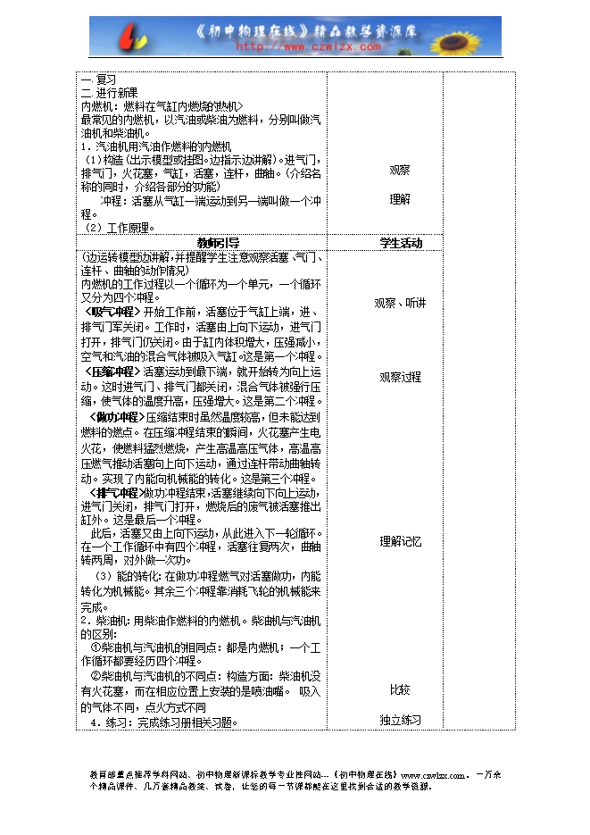 (边运转模型边讲解,并提醒学生注意观察活塞、气门、连杆、曲轴的动作情况) 内燃机的工作过程以一个循环为一个单元,一个循环又分为四个冲程。 〈吸气冲程〉开始工作前,活塞位于气缸上端,进、排气门军关闭。工作时,活塞由上向下运动,进气门打开,排气门仍关闭。由于缸内体积增大,压强减小,空气和汽油的混合气体被吸入气缸。这是第一个冲程。〈压缩冲程〉活塞运动到最下端,就开始转为向上运动。这时进气门、排气门都关闭,混合气体被强行压缩,使气体的温度升高,压强增大。这是第二个冲程。〈做功冲程〉压缩结束时虽然温度较高,但未能达到燃料的燃点。在压缩冲程结束的瞬间,火花塞产生电火花,使燃料猛烈燃烧,产生高温高压气体,高温高压燃气推动活塞向上向下运动,通过连杆带动曲轴转动。实现了内能向机械能的转化。这是第三个冲程。〈排气冲程〉做功冲程结束,活塞继续向下向上运动,进气门关闭,排气门打开,燃烧后的废气被活塞推出缸外。这是最后一个冲程。