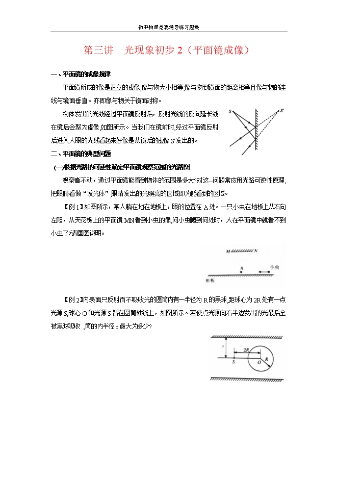 【内容简介】一、平面镜的成像规律平面镜所成的像是正立的虚像,像与物大小相等,像与物到镜面的距离相等且像与物的连线与镜面垂直。亦即像与物关于镜面对称。物体发出的光线经过平面镜反射后,反射光线的反向延长线在镜后会聚为虚像,如图所示。当我们在镜前时,经过平面镜反射后进入人眼的光线看起来好像是从镜后的虚像S'发出的。二、平面镜的典型问题 (一)根据光路的可逆性确定平面镜观察范围的光路图观察者不动,通过平面镜能看到物体的范围是多大?对这--问题常应用光路可逆性原理,把眼睛看做“发光体”,眼晴发出的光照亮的区域即为能看到的区域。【例1】如图所示,某人躺在地在地板上,眼的位置在A处。一只小虫在地板上从右向左爬,从天花板上的平面镜MN看到小虫的像,问小虫爬到何处时,人在平面镜中就看不到小虫了?请画图说明。 【例2】内表面只反射而不吸收光的圆筒内有一半径为R的黑球,距球心为2R处有一点光源S,球心O和光源S皆在圆筒轴线上,如图所示。若使点光源向右半边发出的光最后全被黑球吸收 ,筒的内半径r最大为多少? (二)平面镜与物体间的相对运动由平面镜成像特点——像与物关于镜面对称,易得以下结论:(1)若平面镜不动,物体沿垂直于镜面的方向以速度v向镜面运动,则像以速度v向镜面运动(对镜的速度),像相对于物体以速度2v运动。(2)若物体不动,镜沿垂直于镜面的方向以速度v向物体运动,则像相对镜以速度v向镜面运动,像相对物体以速度2v运动。【例3】一个点光源S放在平面镜MN前,若MN不动,光源S以2m/s的速度沿与镜面成60°角的方向向右做匀速直线运动,如图所示,则光源在镜中的像将( )。