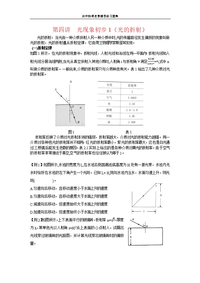 【内容简介】光的折射:当光由一种介质斜射人另一种介质中时,光的传播路径发生偏折的现象叫做光的折射,光的折射遵从折射定律,它由荷兰物理学家斯涅耳发现。 (一)折射定律如图1所示,在光的折射现象中,折射光线、人射光线和法线在同一平面内;折射光线和人射光线分居法线两侧;当光从真空斜射入其他介质时,人射角i与折射角γ满足sini/sinr=n,式中n叫做介质的折射率。一般说来,介质的折射率只与介质种类有关。表1给出了几种介质对光的折射率。 图1 表1折射率反映了介质对光折射本领的强弱,折射率越大,介质对光的折射能力越强。同一介质对各种色光的折射率并不相同,红光的折射率最小,紫光的折射率最大,这也是白光通过三棱镜后能发生色散的原因。表2.1实际上给出的是各种介质对黄光的折射率。由于空气的折射率非常接近于真空,空气的折射率也往往被认为等于1。【例1】如图所示,水池的宽度为L,在水池右侧距离池底高度为H处有一激光束,水池内无水时恰好在水池的左下角产生一个光斑。已知L= H,现向水池内注水,水面匀速上升,则光斑( )。A.匀速向右移动,且移动速度小于水面上升的速度B.匀速向右移动,且移动速度大于水面上升的速度C.减速向右移动,但速度始终大于水面上升的速度D.加速向右移动,但速度始终小于水面上升的速度【例2】如图所示,上下表面平行的玻璃砖,折射率n=√3,厚度为h,某单色光以人射角i=60°从上表面的O点射人,试画出光线穿过玻璃砖的光路图,并计算光线穿出玻璃砖时的偏移量。(二)光的全反射当光由水或其他介质斜射向空气时,在分界面上,有一部分 光线会发生反射而返回到原介质中,另一部分光线发生折射,折射角大于人射角,从而折射光线远离法线。当人射角增大时.折射角也会随之增大,同时折射光强度变弱,反射光强度增强。当人射角增大到某一值C(还未到90°时,折射角就已经达到90°,折射光线与界面重合。如果人射角再增大,折射光会消失,而只有反射光,这种现象叫做光的全反射。整个过程如图 (a)~(c)所示。使折射角恰好等于90°时的入射角称为临界角。当光从水或玻璃棱镜里射向它们和空气的分界面时,只要人射角大于临界角,光就全部反射回水或玻璃棱镜中。根据折射定律,可以求得介质的临界角(sin90°)/sinC=n.由sin90°=1,得sinC=1/n.
