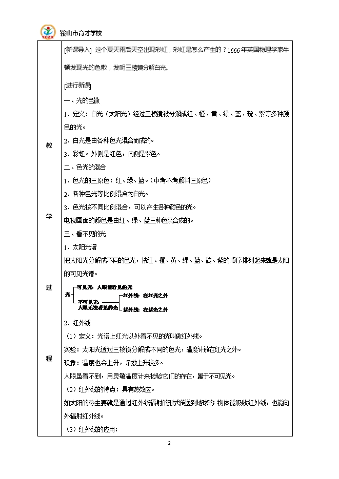 【内容简介】[新课导入] 这个夏天雨后天空出现彩虹,彩虹是怎么产生的?1666年英国物理学家牛顿发现光的色散,发明三棱镜分解白光。[进行新课]一、光的色散1.定义:白光(太阳光)经过三棱镜被分解成红、橙、黄、绿、蓝、靛、紫等多种颜色的光。2.白光是由各种色光混合而成的。3.彩虹。外侧是红色,内侧是紫色。二、色光的混合1.色光的三原色:红、绿、蓝。(中考不考颜料三原色)2.各种色光等比例混合为白光。3.色光按不同比例混合,可以产生各种颜色的光。电视画面的颜色是由红、绿、蓝三种色条合成的。三、看不见的光1.太阳光谱把太阳光分解成不同的色光,按红、橙、黄、绿、蓝、靛、紫的顺序排列起来就是太阳的可见光谱。 2.红外线(1)定义:光谱上红光以外看不见的光叫做红外线。实验:太阳光透过三棱镜分解成不同的色光,温度计放在红光之外。现象:温度也会上升,示数上升较多。人眼虽看不到,用灵敏温度计来检验它们的存在,属于不可见光。(2)红外线的特点:具有热效应。如太阳的热主要就是通过红外线辐射的形式传送到地球的;物体能吸收红外线,也能向外辐射红外线。(3)红外线的应用: