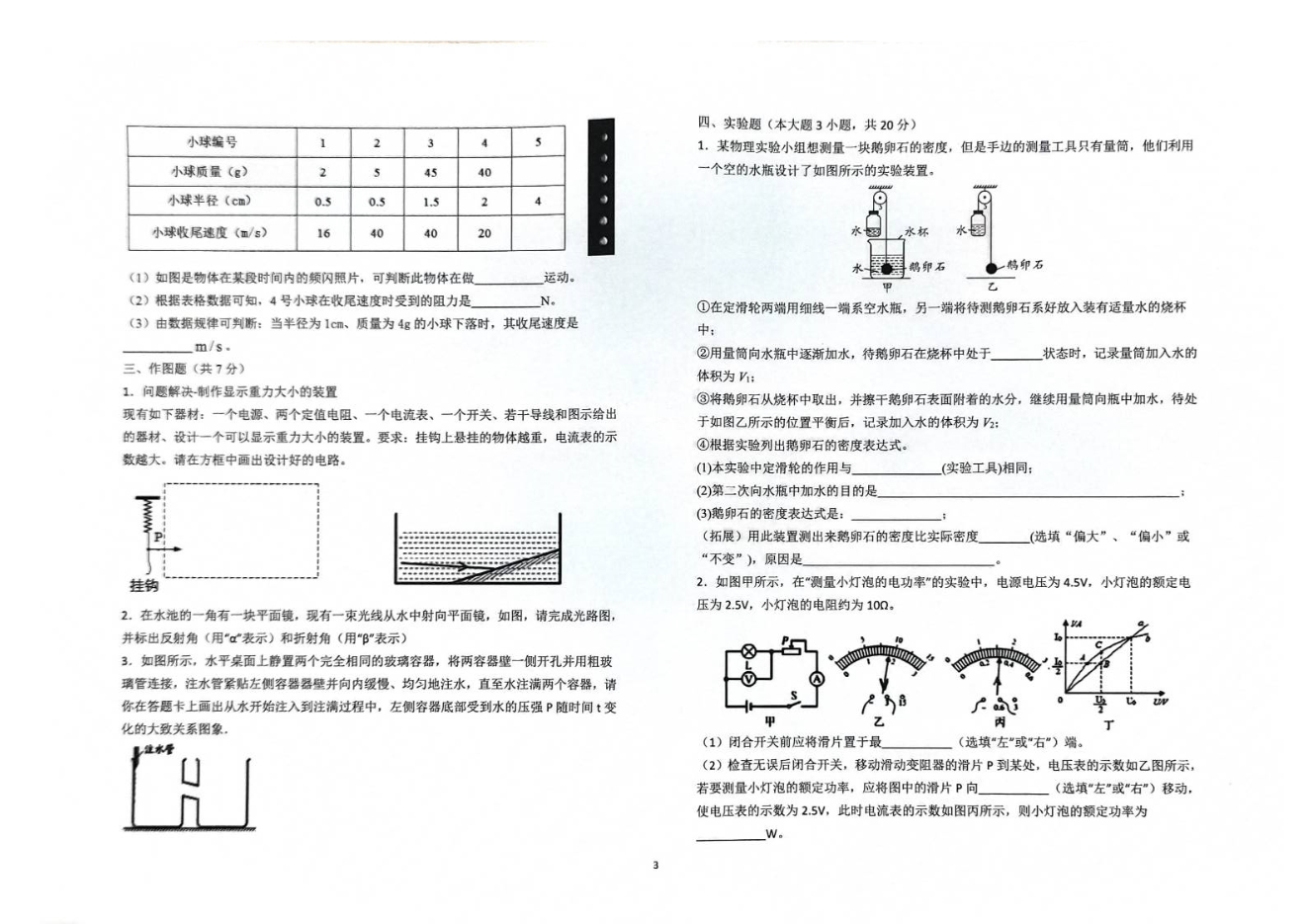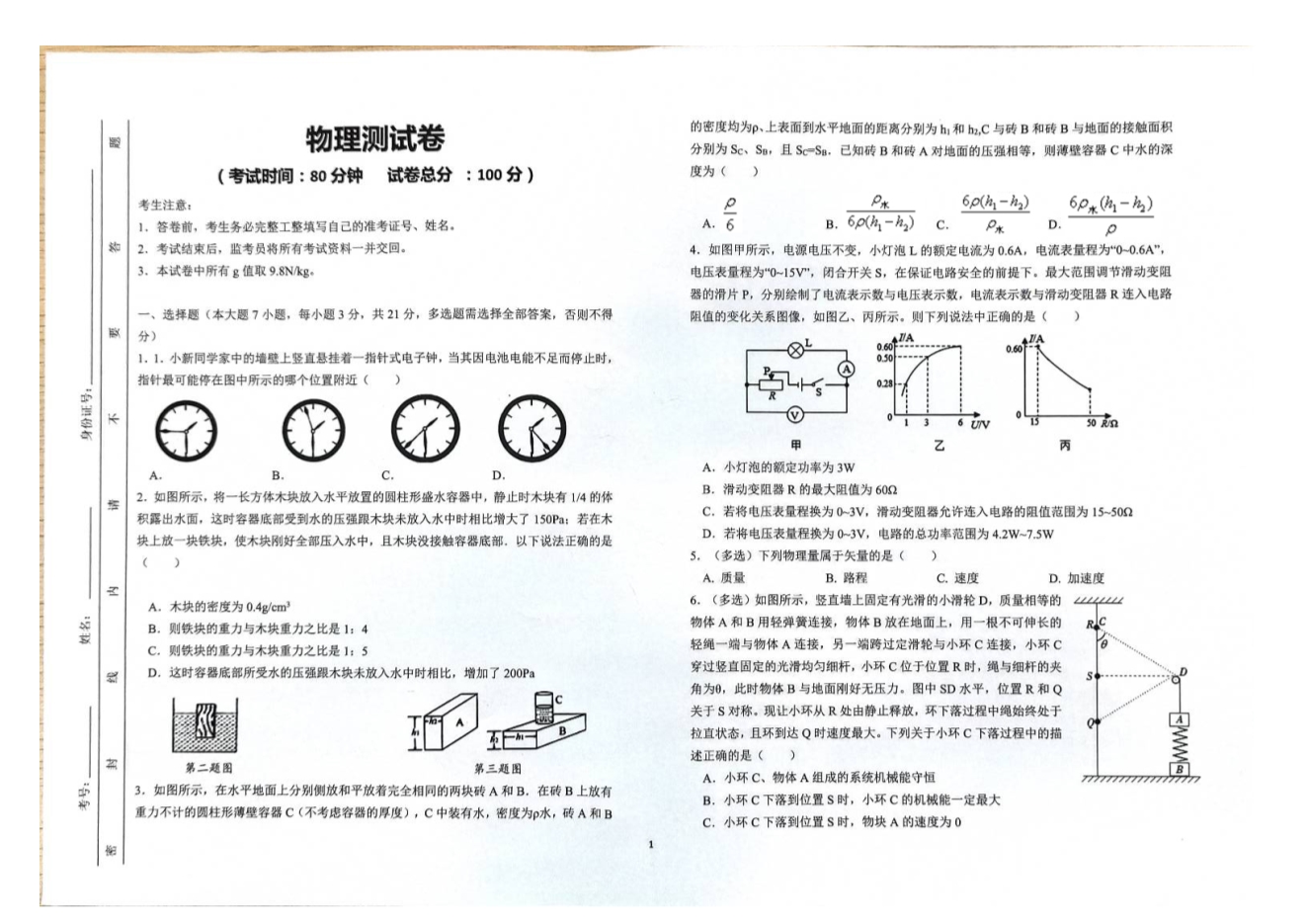 2020年东华高级中学新高一实验班选拔测试物理试卷(扫描版无答案)